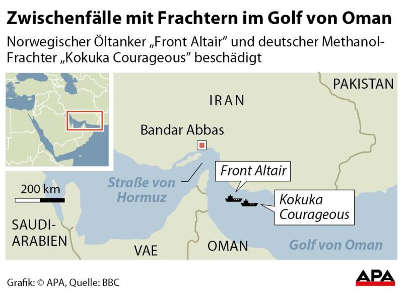 Die genauen Umstände der schweren Zwischenfälle am Vortag blieben zunächst weiter mysteriös. Der japanische Betreiber eines der Schiffe bestritt, dass der Tanker von einem Torpedo getroffen wurde. Das zweite der beiden Schiffe, die "Front Altair" einer norwegischen Reederei, geriet nach Explosionen in Brand.
