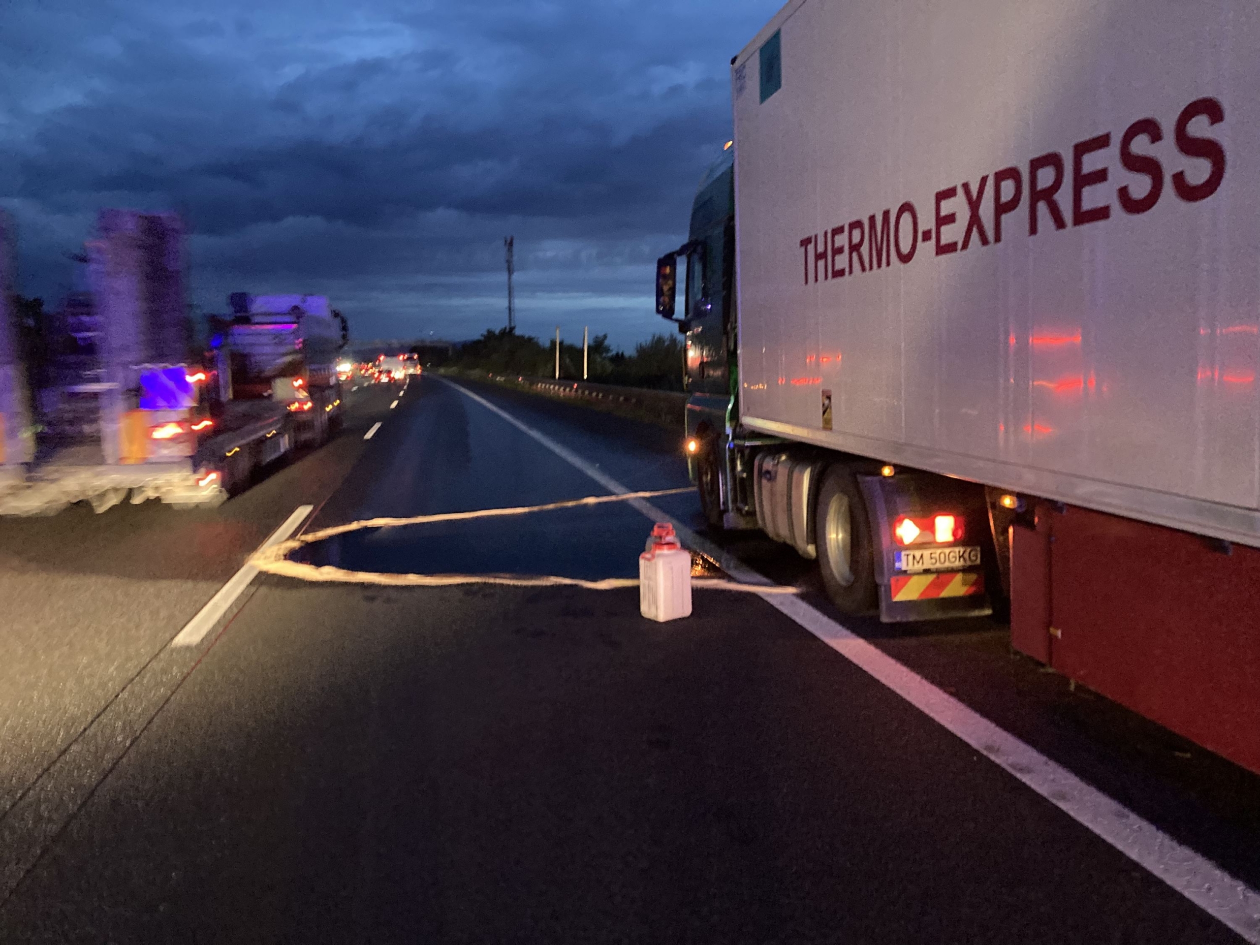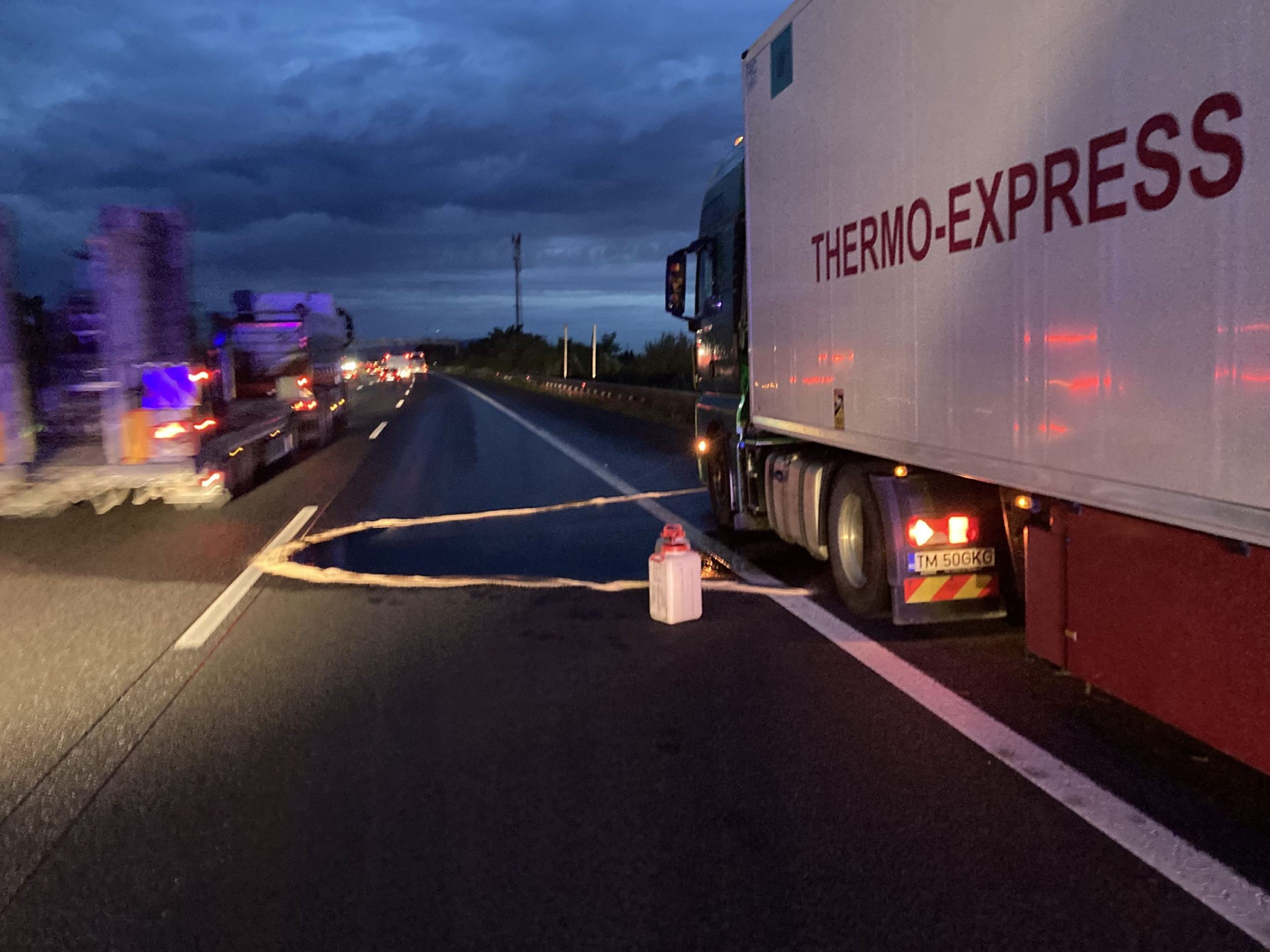 In den frühen Morgenstunden des 14.9.2022 wurde die Feuerwehr Wiener Neustadt zu einem leckgeschlagenen Dieseltank auf die A2 gerufen. Vermutlich aufgrund eines auf der Fahrbahn liegenden Teils wurde ein Loch in einen Dieseltank bei einem Lkw geschlagen.