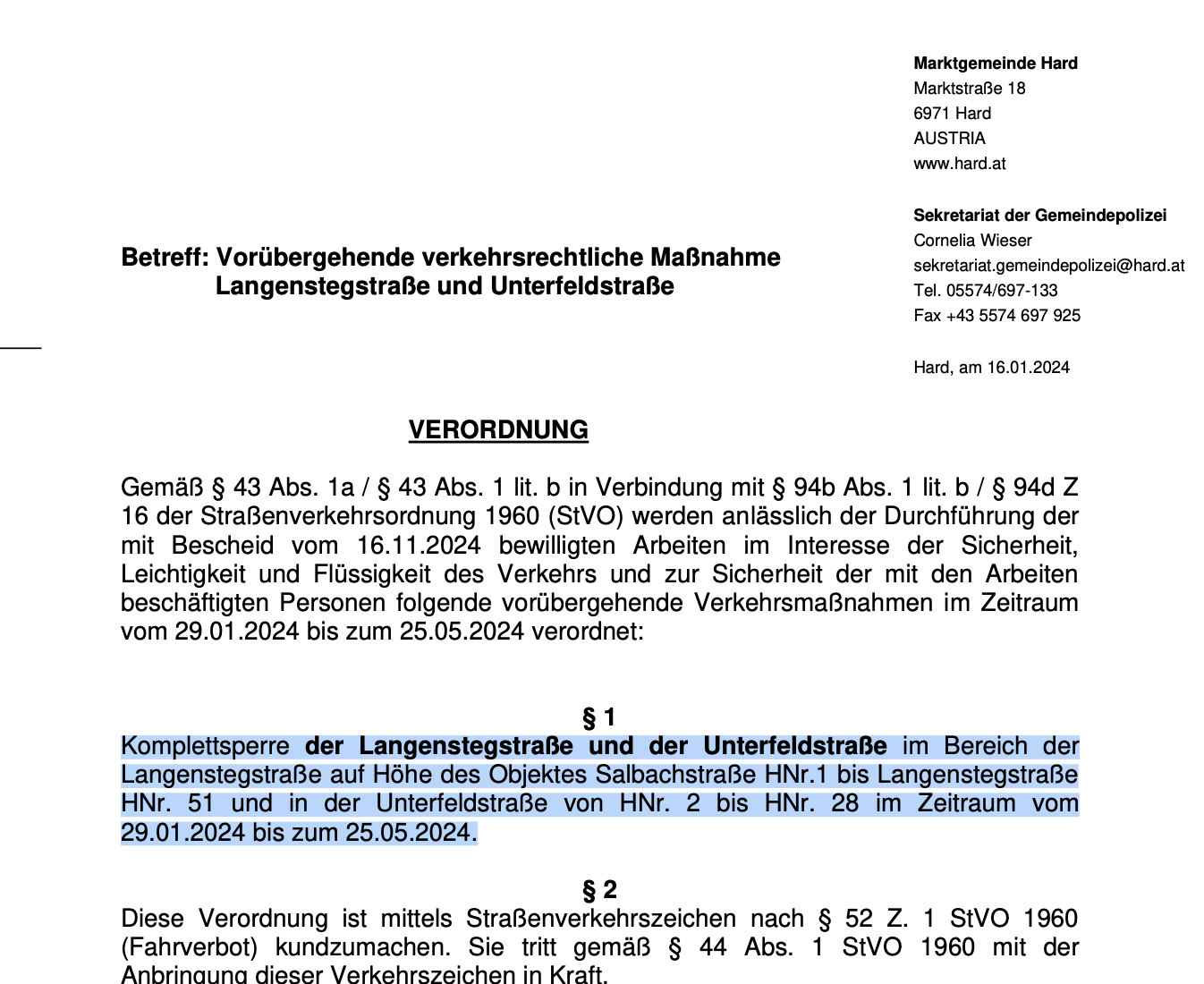 Die Sperre betrifft laut Verordnung der Gemeinde Hard den Bereich der Langenstegstraße von der Salbachstraße Hausnummer 1 bis zur Langenstegstraße Hausnummer 51 und der Unterfeldstraße von Hausnummer 2 bis Hausnummer 28.