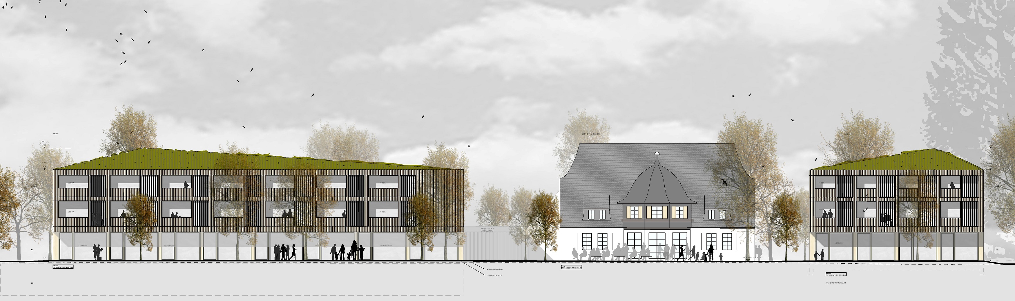 Herzstück des Ensembles ist die Villa Gminder mit großer Terrasse zum See. In ihren historischen Salons wird ein Restaurant zum Treffpunkt für Gäste und Einheimische. Rund um die Villa entstehen vier Neubauten, die das denkmalgeschützte Villengebäude respektvoll in ihre Mitte nehmen. Inmitten des parkartigen Geländes mit wertvollem Baumbestand und Biotopen fügen sie sich mit Fichtenholzfassaden und begrünten Zeltdächern zurückhaltend und harmonisch in die Uferlandschaft ein. "Das Zeppelin" wird Platz für 62 Zimmer, für Seminar- und Veranstaltungsräume sowie einen kleinen Wellness- und Fitnessbereich bieten.