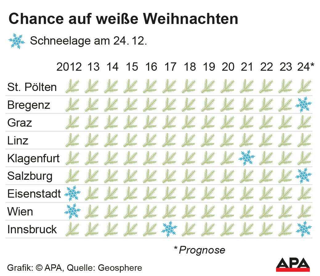 Weiße Weihnachten in den Landeshauptstädten sind eine Rarität - zuletzt war das 2021 in Klagenfurt der Fall, davor 2017 in Innsbruck und 2012 in Wien und Eisenstadt. Heuer sollte am 24. Dezember gleich in drei Großstädten - Bregenz, Innsbruck und Salzburg - Schnee liegen, wobei die Prognose der Geosphere Austria für die Mozartstadt wackelt. "Direkt vor dem Dom wird wohl nichts zu finden sein, aber die Berge rund um Salzburg werden weiß sein", so ein Meteorologe.