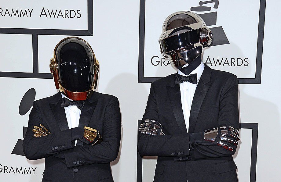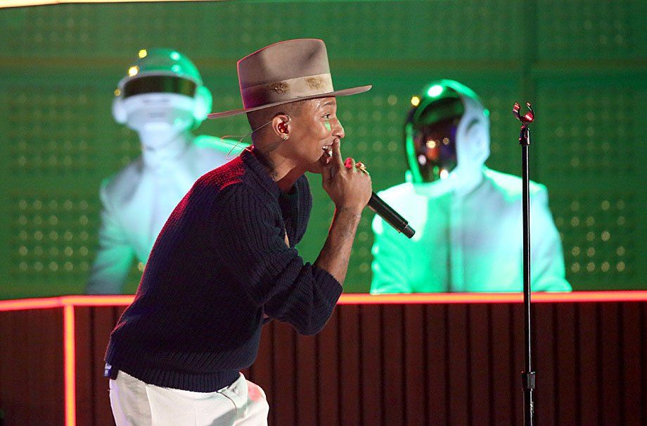 HÖHEPUNKT: Daft Punk waren mit ihrer Wahl ausgefallener Kopfbedeckung nicht allein: Pharrell Williams sah mit seinem Hut so aus, als ob er sich um einen Posten als Park-Ranger bewerben wollte.
