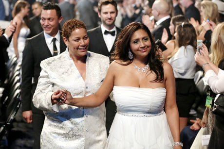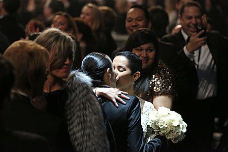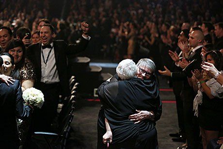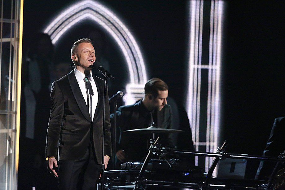 HÖHEPUNKT: Eine emotionale Darbietung des Songs “Same Love” durch das Rap-Duo Macklemore & Ryan Lewis zusammen mit Mary Lambert, bei dem dutzende Paare sich das Ja-Wort gaben.