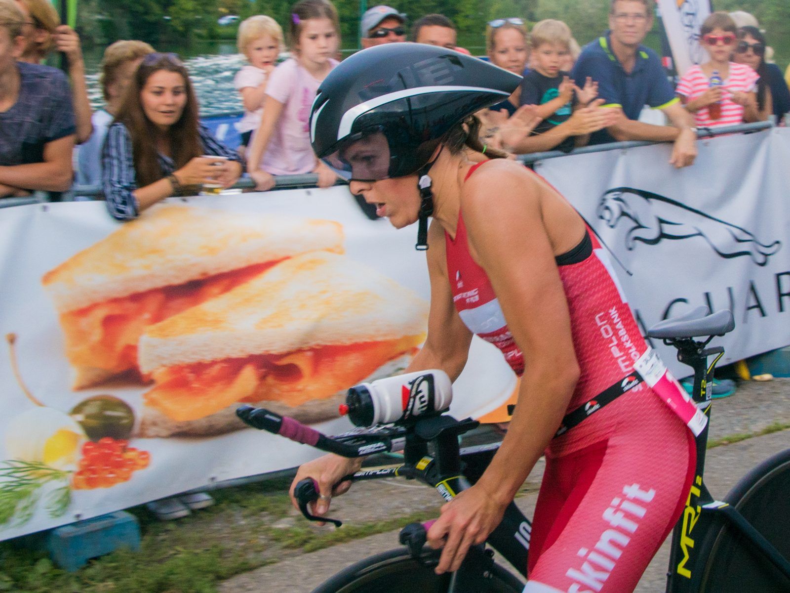 Nach den 3,8km Schwimmen, stieg sie als 7te mit 7 Minuten Rückstand aus dem Wasser.  Eine sehr gute Ausgangsposition für ihre Paradedisziplin das Radfahren.