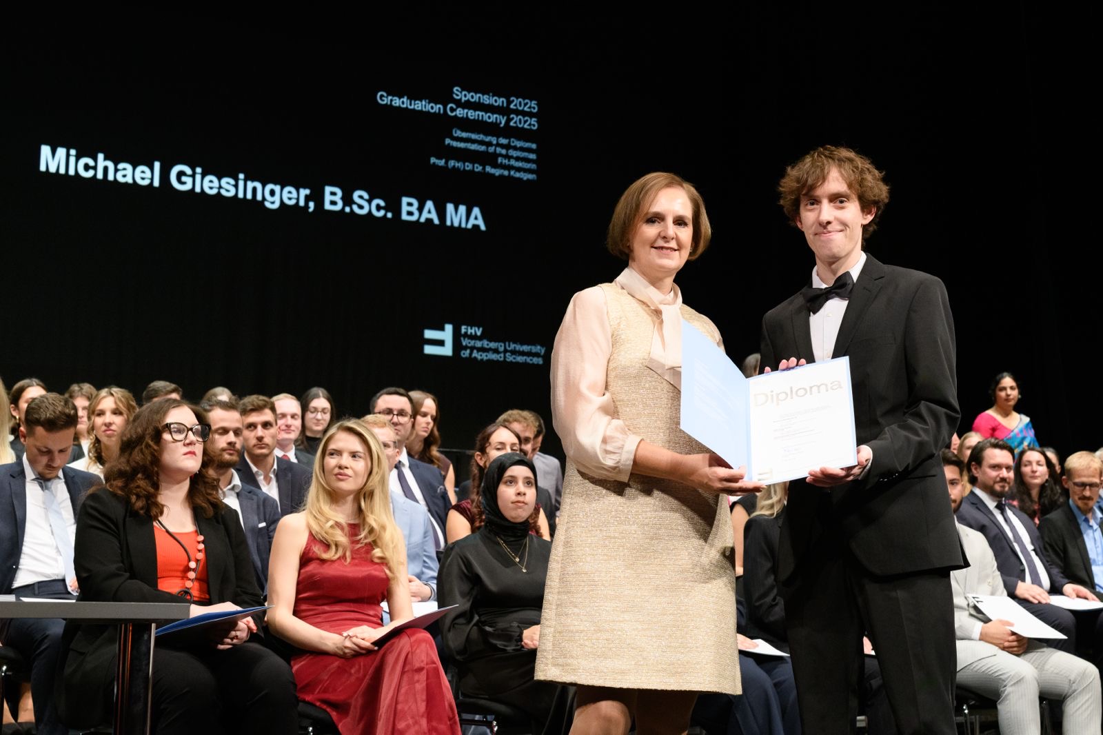 Beide Studien schloss er mit Auszeichnung ab. Und weil das nicht genügte, machte er berufsbegleitend auch noch den Master in "International Marketing & Sales" und arbeitete parallel beim ORF Vorarlberg. Mitten im Studium wurde er Student Ambassador, das Gesicht seines Studienganges bei Messen, Führungen und Events. Dass er auf allen Bühnen gleichzeitig spielen kann, hat er längst bewiesen.