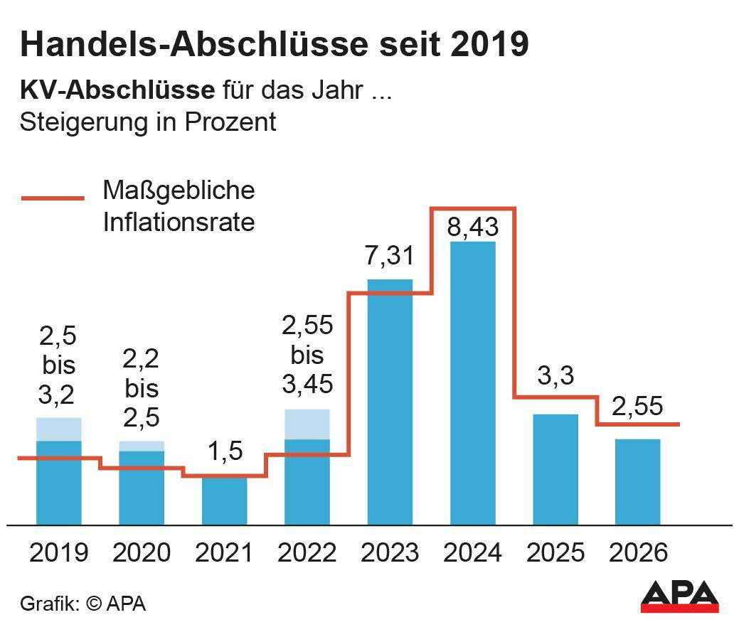 Arbeitgeber- und Arbeitnehmervertreter haben sich in der dritten Runde auf einen Handels-KV-Abschluss unter der Inflationsrate geeinigt. Die Angestellten-Mindestgehälter steigen mit 1. Jänner 2026 um 2,55 Prozent.