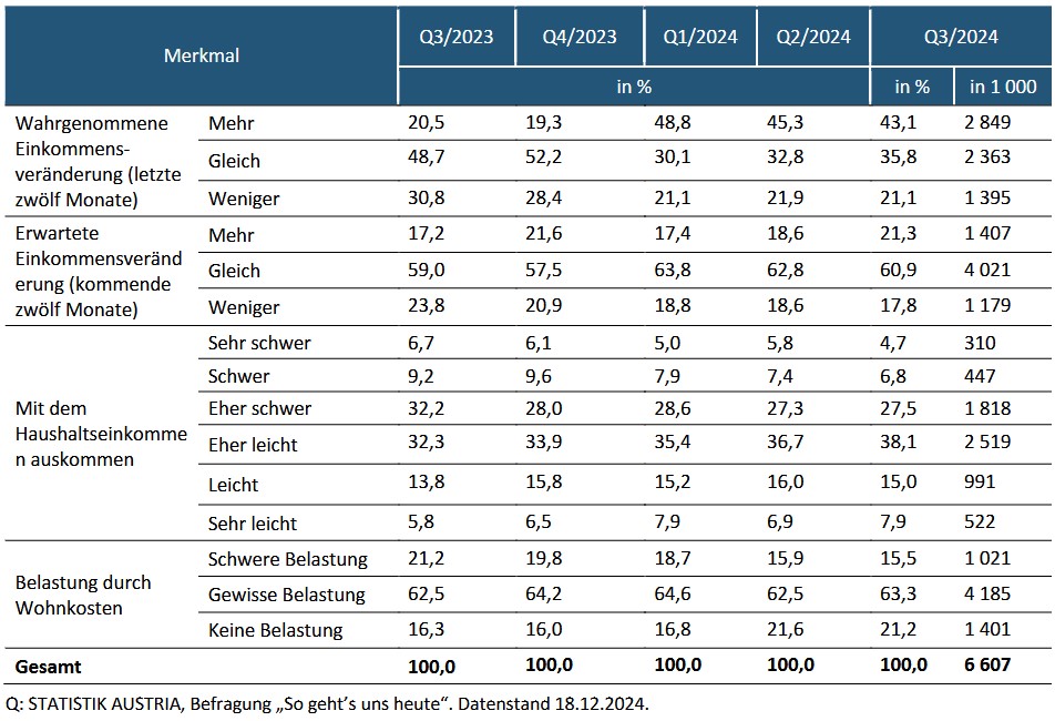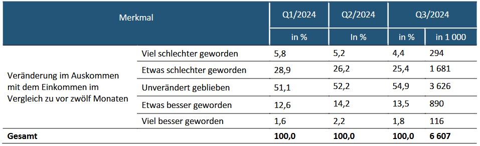Im dritten Quartal 2024 gaben zwar 21 Prozent der Befragten an, in den vergangenen zwölf Monaten Einkommensverluste erlitten zu haben. Allerdings hat sich für 43 Prozent die Einkommenssituation leicht bzw. sehr verbessert.