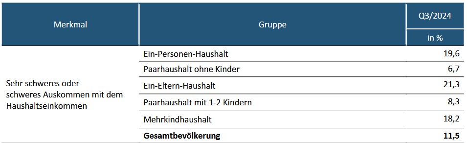 Auch Personen in Ein-Eltern-Haushalten mit jungen Kindern (zu 70 Prozent) kamen im Vergleich zu Personen in Ein-Personen-Haushalten (50 Prozent) schlechter mit dem Einkommen aus. Weiters sind für ein Drittel der Personen in Ein-Eltern-Haushalten mit jungen Kindern die Wohnkosten eine schwere Belastung. Für mehr als die Hälfte (53 Prozent) dieser Gruppe ist ein jährlicher Urlaub von einer Woche nicht leistbar.