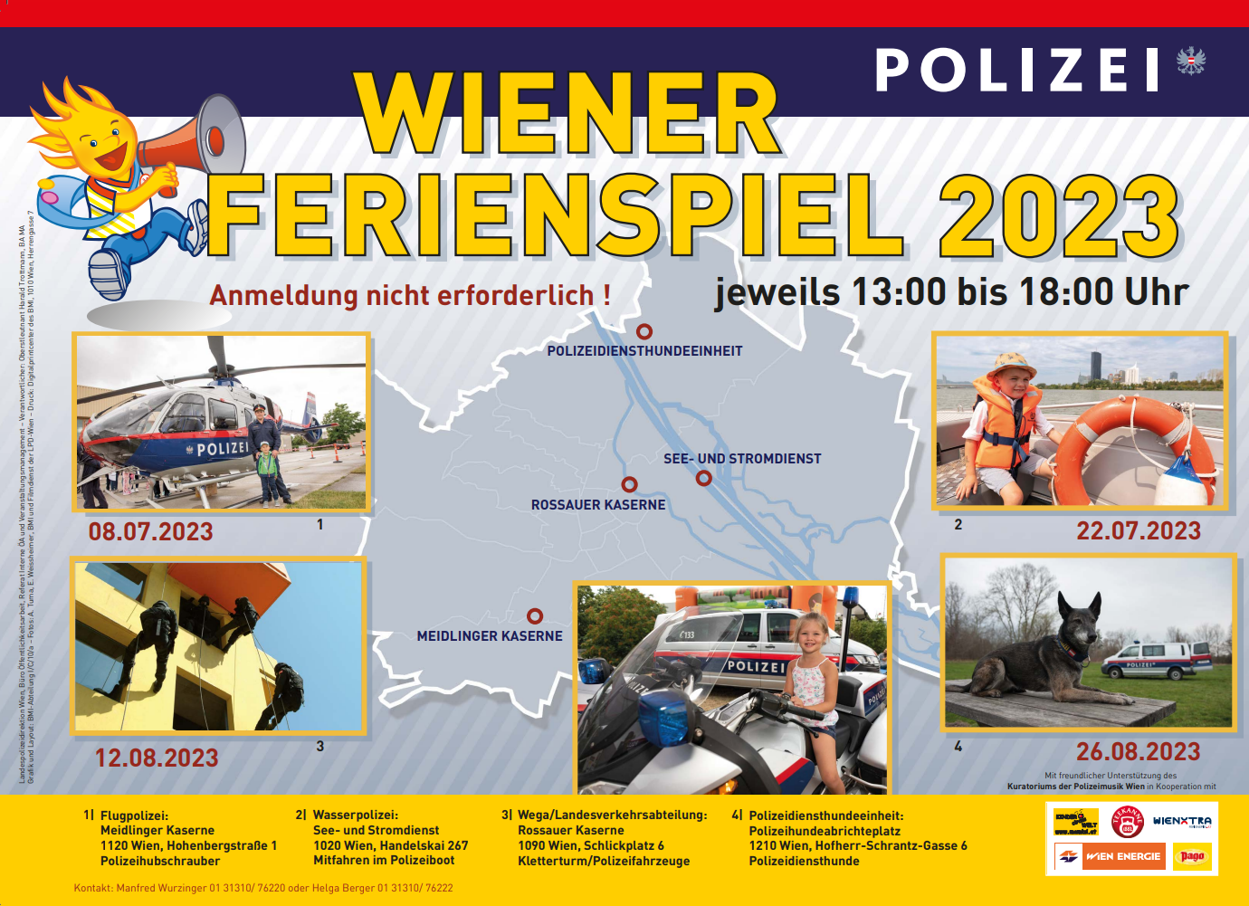 Gezeigt und vorgestellt werden unter anderem „Gustav, der sprechende Funkwagen“, eine Waffen- und Geräteschau der WEGA und der Polizeidiensthundeeinheit, die Kinderpolizei sowie ein Polizeimotorrad. Als Höhepunkt gibt es eine Seiltechnikvorführung und die Möglichkeit unter fachkundiger Anleitung von Beamten der WEGA den Kletterturm zu erklimmen. Schon jetzt möchte die Landespolizeidirektion Wien auf den nächsten Ferienspieltermin der Wiener Polizei am 26. August 2023, von 13:00 bis 18:00 Uhr hinweisen. Dieser findet in 21., Hofherr-Schrantz-Gasse 6, am Geländer der Polizeidiensthundeeinheit statt.