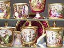 Die großen Porzellanmanufakturen, vor allem Wien, aber auch Meissen, Berlin, Sèvres und russische Manufakturen besaßen umfangreiche Kupferstichsammlungen, natürlich auch mit zahlreichen Stichen nach Kauffmann, die dort von den besten Porzellanmalern auf Porzellan übertragen wurden. Kauffmann Motive waren mit Abstand am beliebtesten, kein anderer Künstler wurde so häufig auf Porzellan reproduziert. Solche Miniaturmalerei wurde von den sogenannten Historienmalern ausgeführt, die die angesehensten und besten Maler waren, und – was sonst nicht üblich war – auch ihre Porzellangemälde signieren durften, wie vier Tassen der Schwarzenberger Sammlung mit der Signatur K. Herr zeigen.