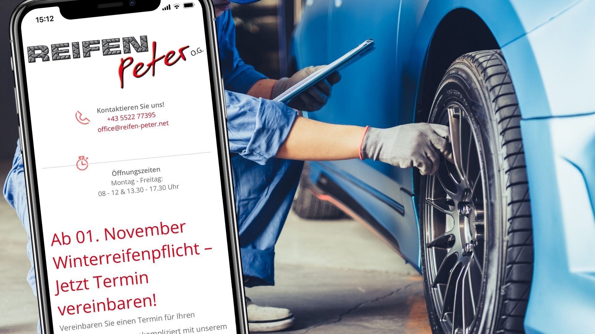 Neben dem klassischen Verkauf von Reifen aller gängigen Marken bietet der Betrieb zusätzlich einen umfassenden Service für Ihr Fahrzeug. ©Screenshot Reifen Peter (www.reifen-peter.net)/Canva (Symbolbild)