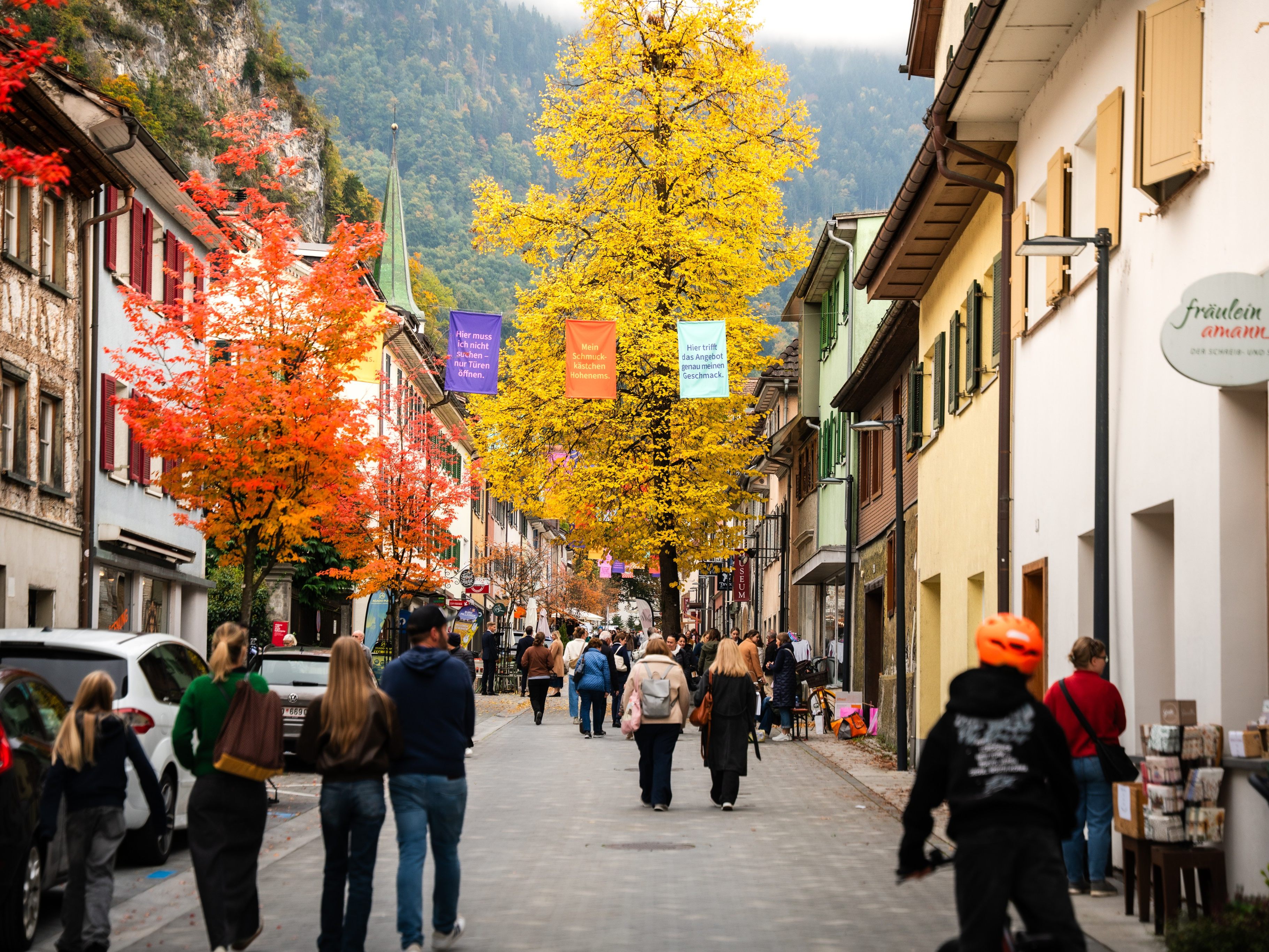 Weiter oben in der Gasse gab es die „Leergut“-Taschen aus Kanistern und sogar Vintage-Fahrräder von „Karlinger Racingbikes“ konnten probegefahren werden. Auch die Hohenemser Geschäfte zeigten ihre besonderen Fundstücke – ideale Orte zum Verweilen und Genießen.