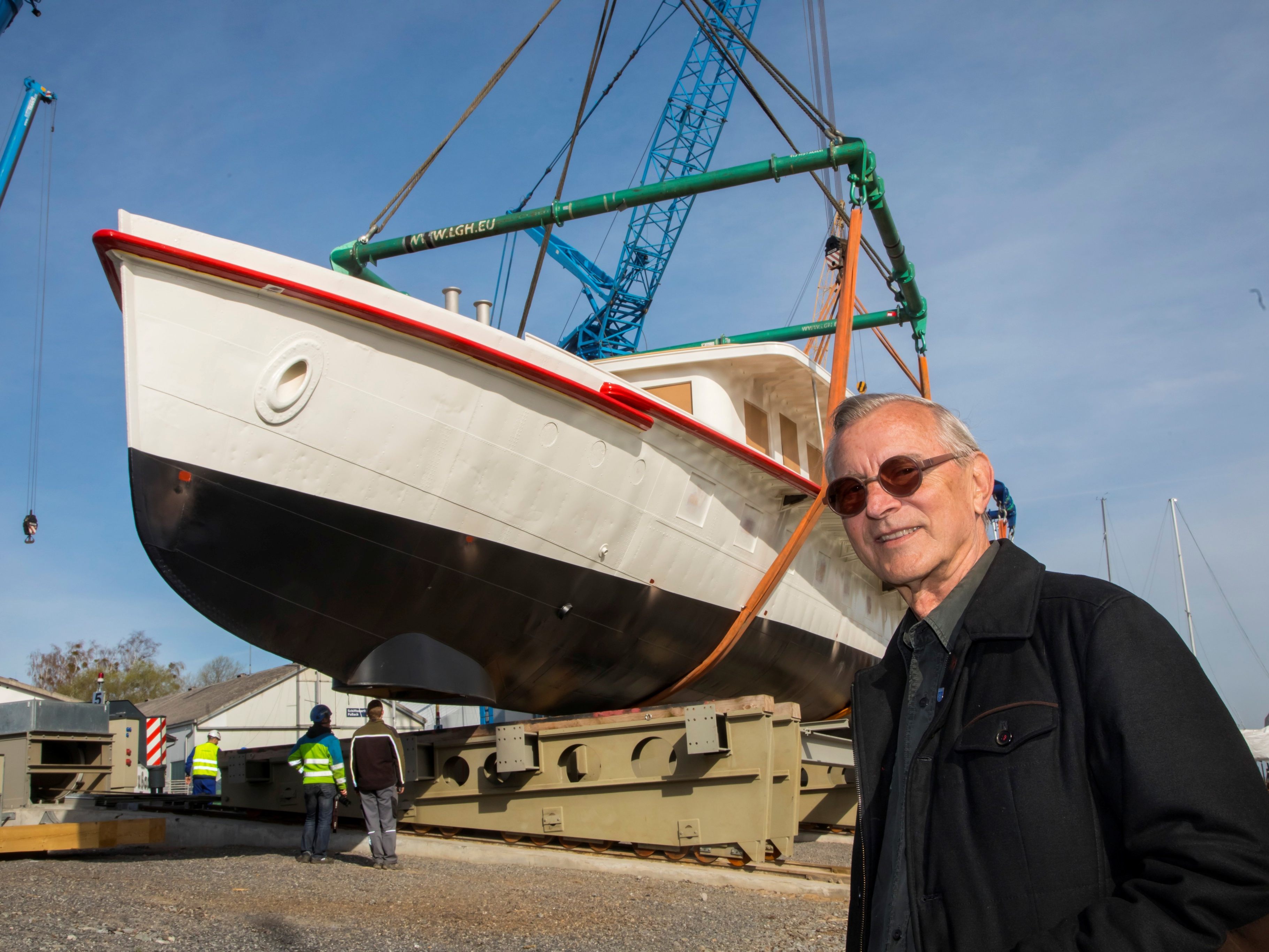 Nach intensiver Vorplanung und Berechnungen durch Bautrans-Felbermayr, werden die Kräne aufgebaut, welche das das Schiff am Dienstagvormittag, dem 10. April auf die Helling umzusetzen. Es wurden dazu zwei Mobilkräne eingesetzt mit Hublasten von 750 und 500 Tonnen. Auf der Slipanlage (Helling) erfolgt dann Mitte April der Einbau der schweren Bauteile wie Motoren, Generatoren, Wellen, Propeller, Bugstrahl, E-Schränke, Lukendeckel, Steuerhaus-Einhebung, Kamin Lufthutzen, Boote, Masten, Geländer, Fenster und vieles mehr. So nimmt das Museumsschiff immer mehr Gestalt an, um dann ab 27. April in Hard, in seiner neuen Heimat, in neuem Glanz zu erstrahlen.