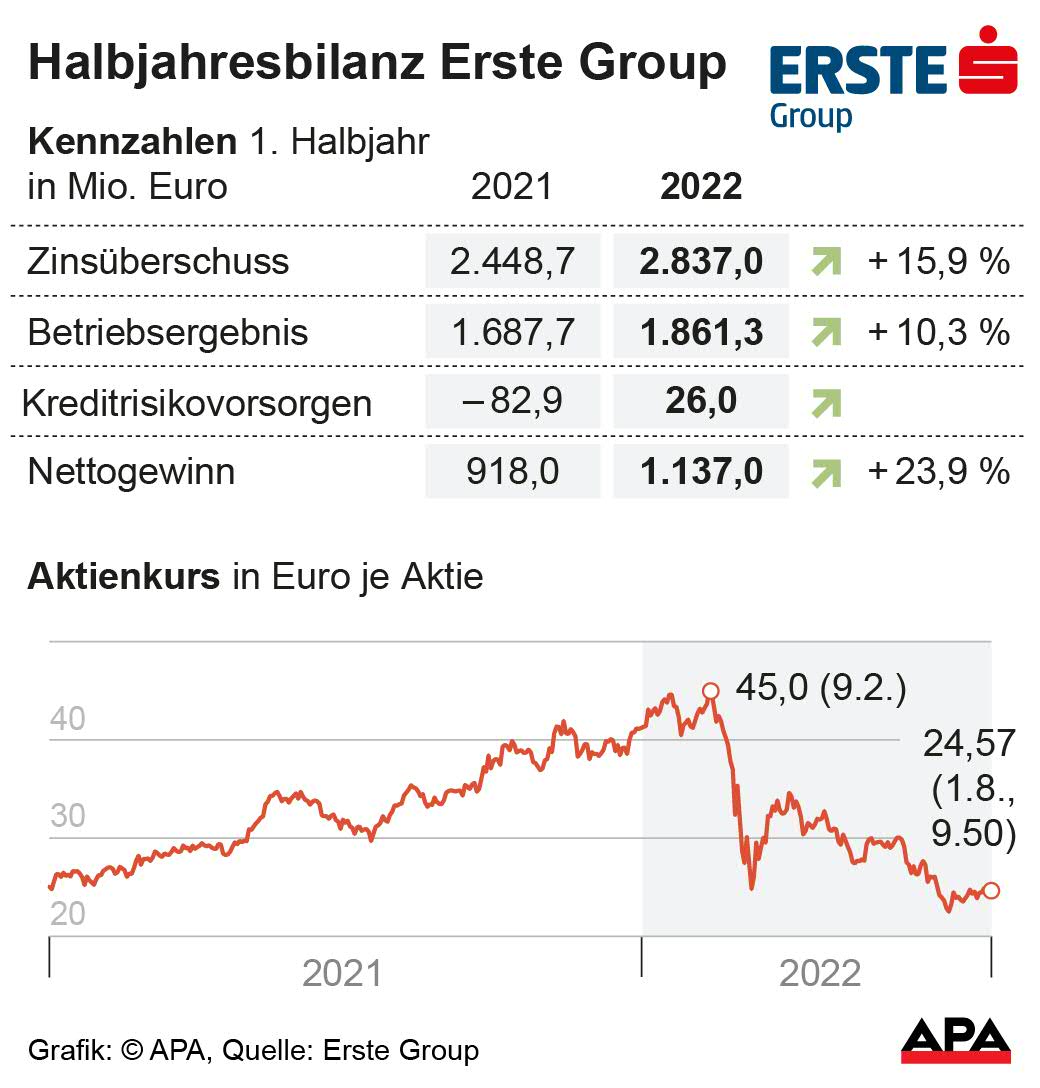 Das Kreditvolumen stieg vor diesem Hintergrund im Halbjahr um 6,3 Prozent auf 191,5 Mrd. Euro an. Vor allem Immobilien- und Unternehmenskredite seien gefragt gewesen. Gemeinsam mit Zinserhöhungen in Tschechien, Ungarn und Rumänien sorgte dies für eine Steigerung beim Zinsüberschuss von 15,9 Prozent auf 2,84 Mrd. Euro. Der Provisionsüberschuss legte um 10,5 Prozent auf 1,21 Mrd. Euro zu.