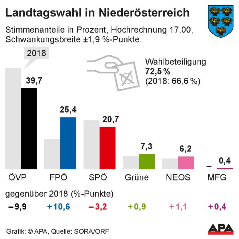 Das Resultat der Landtagswahl war mit Spannung erwartet worden. Der Urnengang gilt auch als Stimmungstest für den Bund, wo die Regierungsparteien ÖVP und Grüne in den Umfragen weit unter ihrem Nationalratswahlergebnis von 2019 liegen und die FPÖ derzeit den höchsten Zuspruch genießt. Die niederösterreichische ist die erste von drei Landtagswahlen des Jahres. Auch Kärnten (5. März) und Salzburg (23. April) bestimmen die Neuzusammensetzung ihrer Landesparlamente.