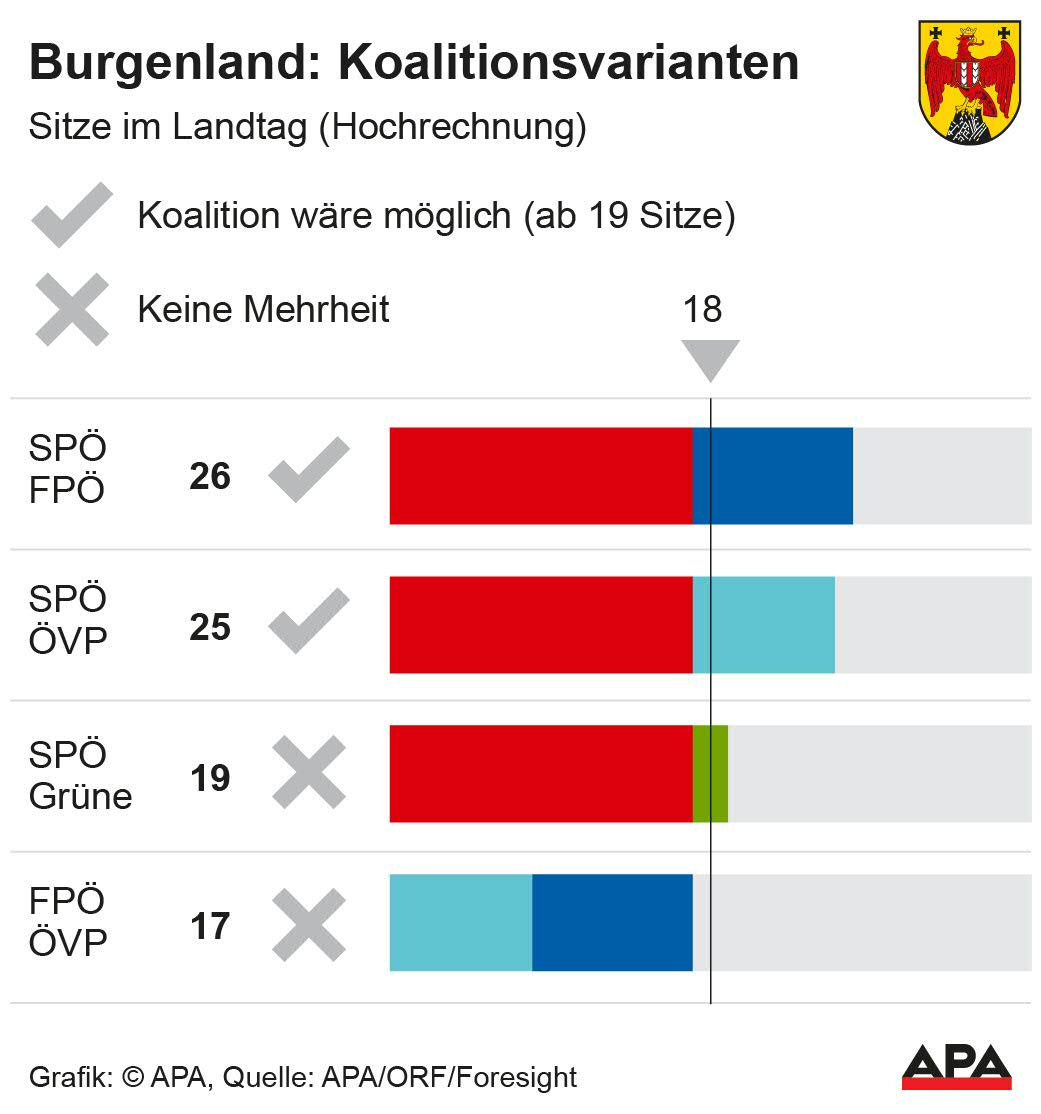 Die ÖVP kommt demnach auf acht, die FPÖ auf neun Mandate (Schwankungsbreite der Hochrechnung: +/- 0,4 Prozentpunkte). Die Grünen halten laut den Hochrechnern mit Sicherheit ihre zwei Sitze und damit ihren Klubstatus. Sie könnten Landeshauptmann Hans Peter Doskozil (SPÖ) zum Verbleib im Amt verhelfen, allerdings nur mit einem Mandat Überhang. Sicherere Partner aus Sicht der Mehrheitsverhältnisse wären für Doskozil FPÖ oder ÖVP.