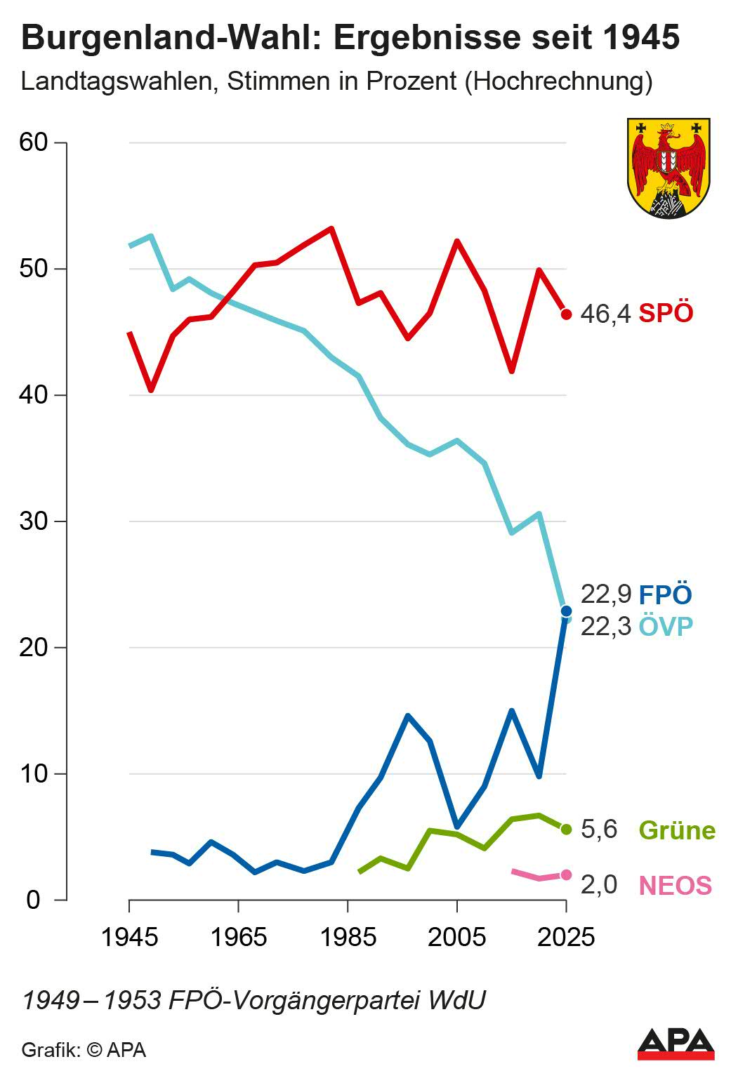 Die Landeshauptmann-Partei von Hans Peter Doskozil büßte damit gegenüber dem Urnengang aus dem Jahr 2020 3,3 Prozentpunkte ein. Damals erzielten die Roten 49,94 Prozent der Stimmen. Die ÖVP lag 2020 mit 30,58 Prozent noch klar auf Rang zwei, die FPÖ damals bei nur 9,80 Prozent. Die Grünen konnten beim vorherigen Urnengang 6,72 Prozent der Wähler überzeugen, die NEOS 1,71 Prozent und die (heuer nicht mehr angetretene) Liste Burgenland 1,26 Prozent.