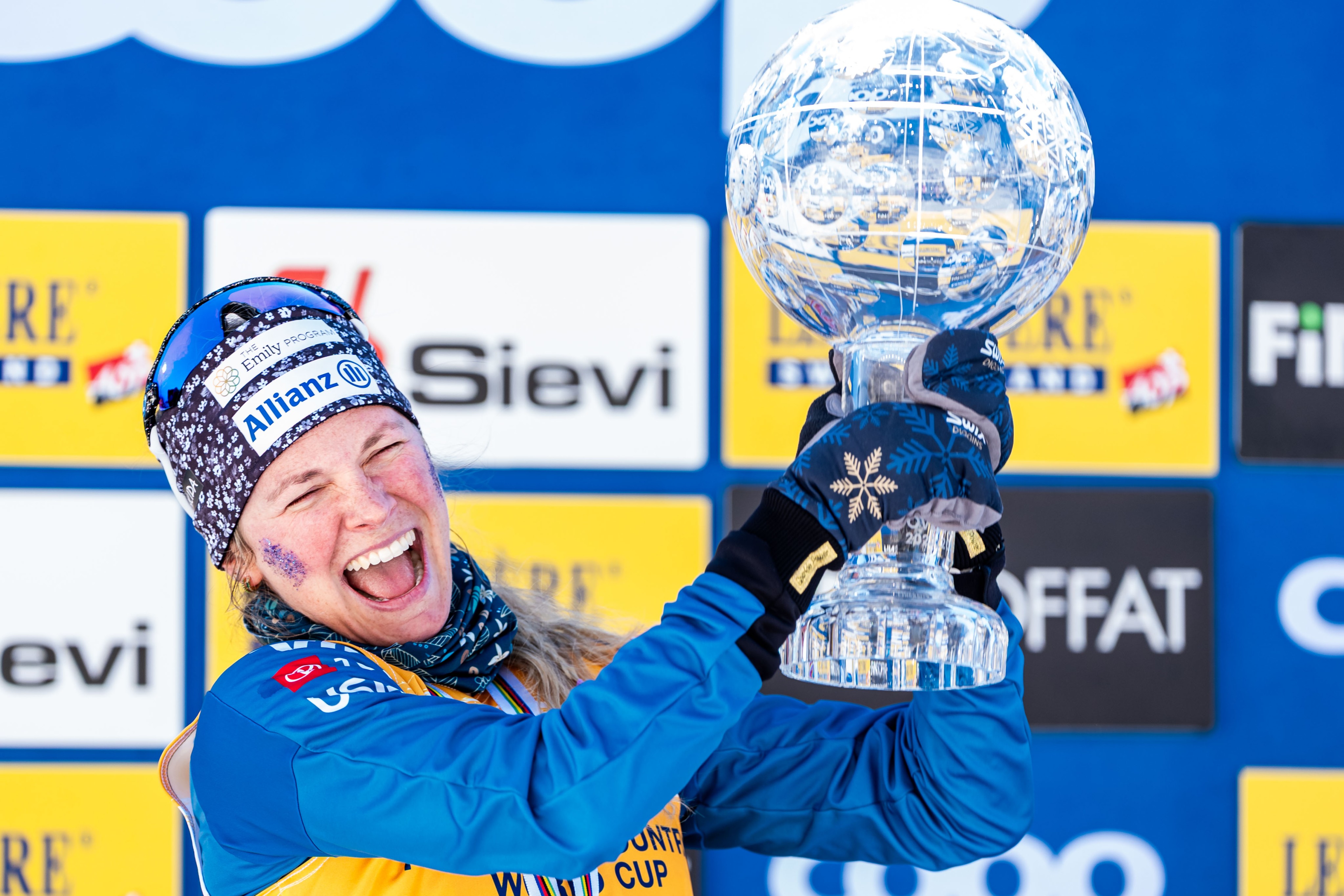 Jessie Diggins jubelt über den Gewinn des Gesamtweltcups beim Langlauf-Weltcup-Finale in Lahti am 23. März 2025. ©APA/AFP