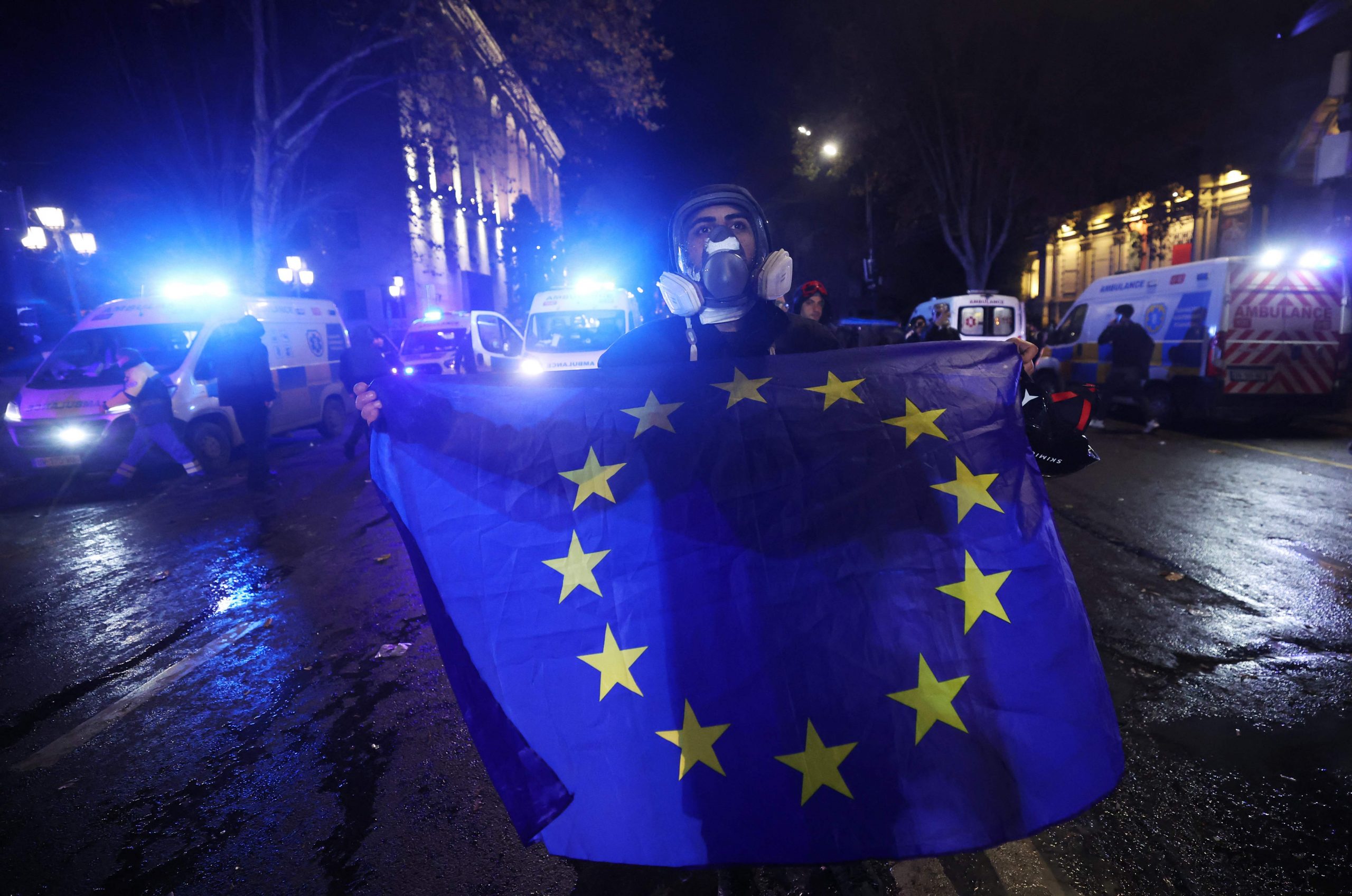 Die nach einer 180-Grad-Wende pro-russisch gewordene Regierungspartei Georgischer Traum hatte am Donnerstag der Europäischen Union Erpressung und das Schüren von Unruhen vorgeworfen und die Verhandlungen über einen EU-Beitritt bis 2028 ausgesetzt. Das Land im Südkaukasus mit seinen 3,7 Millionen Einwohnerinnen und Einwohnern hat aber das Ziel eines EU-Beitritts in seiner Verfassung verankert. Meinungsumfragen zufolge unterstützen rund 80 Prozent der Menschen in Georgien eine EU-Mitgliedschaft ihres Landes.