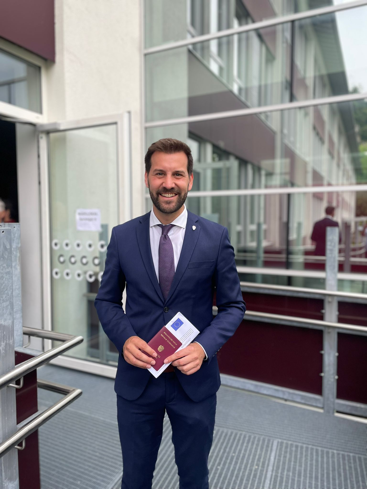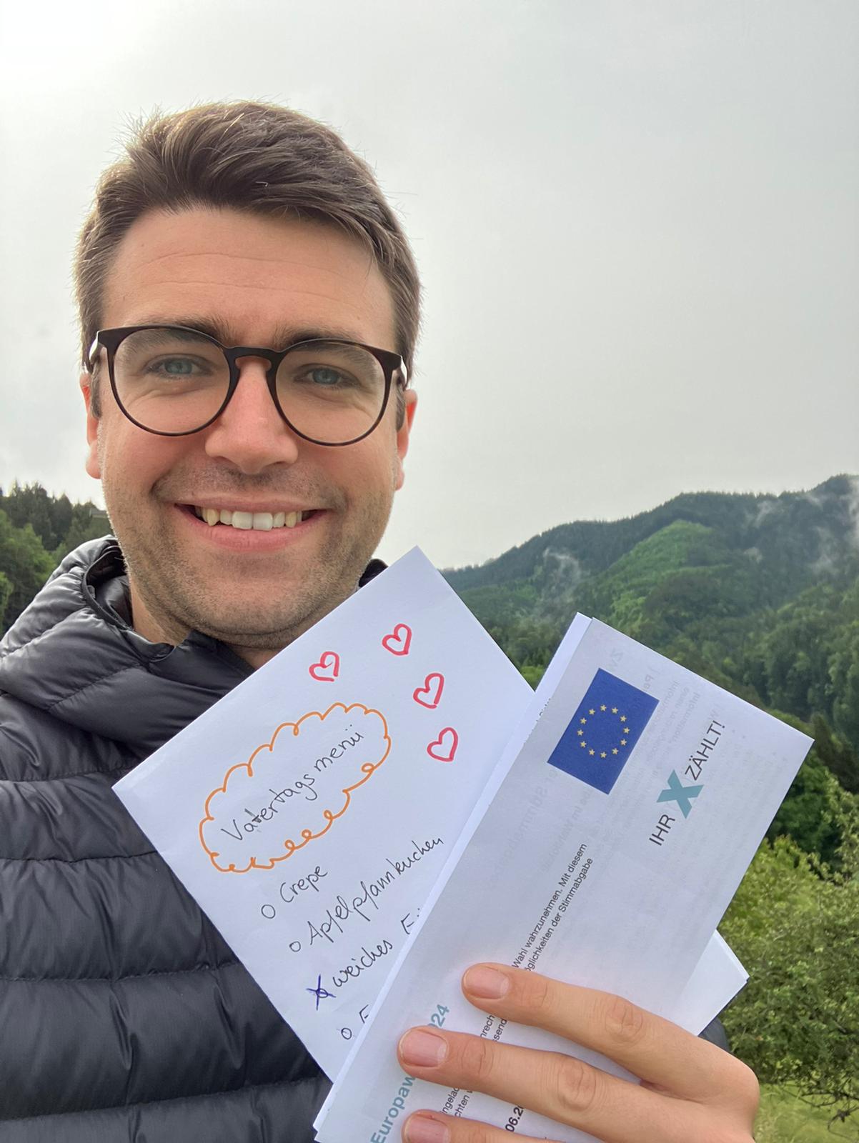 Christoph Gruber (NEOS): "Bisschen spät bin auch ich am Weg zum Wahllokal. Aber die erste Wahl hab ich heute schon hinter mir: Beim Vatertagsmenü habe ich mich klassisch für weiches Ei entschieden. Im Wahllokal wird es NEOS. Lasst uns stärken, was uns stark macht: Europa!"