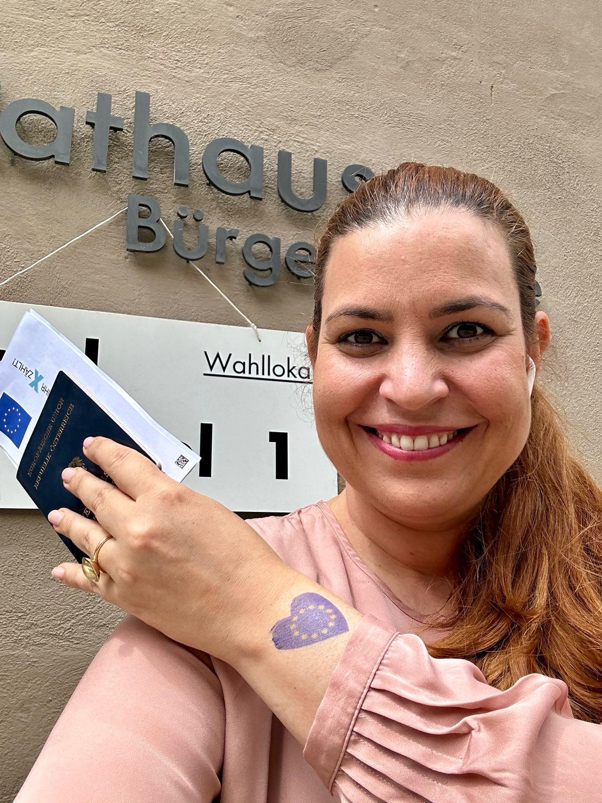Nationalratsabgeordnete Nina Tomaselli beim Wählen in Feldkirch - inklusive EU-„Tattoo“