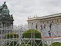 Das überdimensionale Meinl-Kaffeehaus möchte trotz seiner imposanten Dimensionen eine “abgepufferte Ruhezone” werden, haben die Organisatoren zuletzt erklärt. In den kommenden Wochen wird eine 2.668 Quadratmeter große Plattform auf sechs Metern Höhe um das Maria-Theresien-Denkmal angelegt. Auf dieser werden sich drei Zelte befinden, wobei eines über 1.000 Sitzplätze verfügen soll. Auch VIP-Bereiche sind vorgesehen. Erste Gerüstteile sind bereits zu sehen.