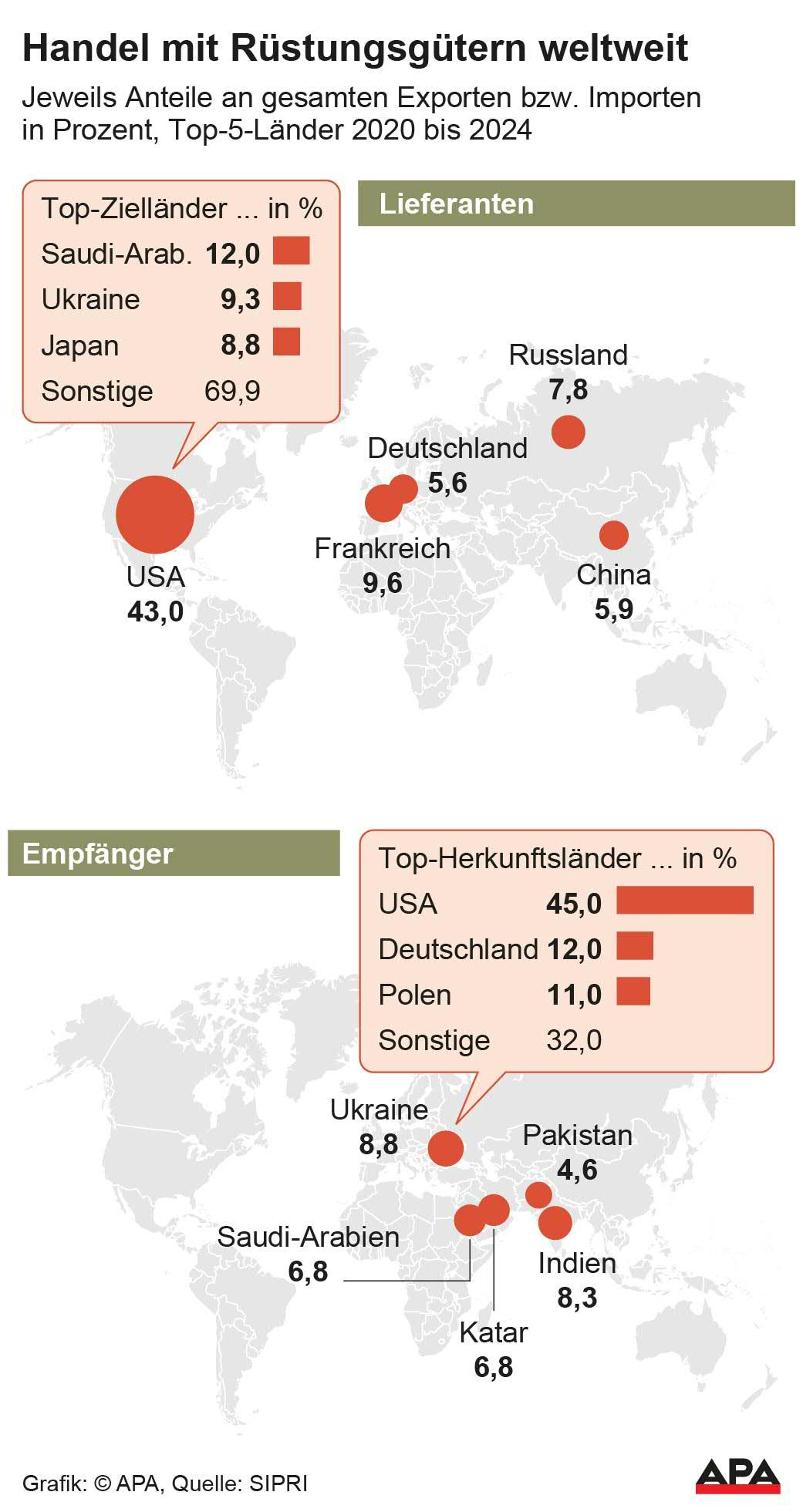 Europas Importsprung hat jedoch nicht nur mit der Ukraine zu tun, sondern auch mit politischen Kurswechseln in den USA: Schon in seiner ersten Amtszeit (2017-2021) hat US-Präsident Trump von den europäischen Nato-Partnern gefordert, ihre Verteidigungsausgaben drastisch zu erhöhen. Viele Europäer haben dem Folge geleistet, wie auch die Sipri-Zahlen untermauern: Die europäischen Nato-Länder haben ihre Rüstungseinfuhren demnach insgesamt mehr als verdoppelt (plus 105 Prozent).