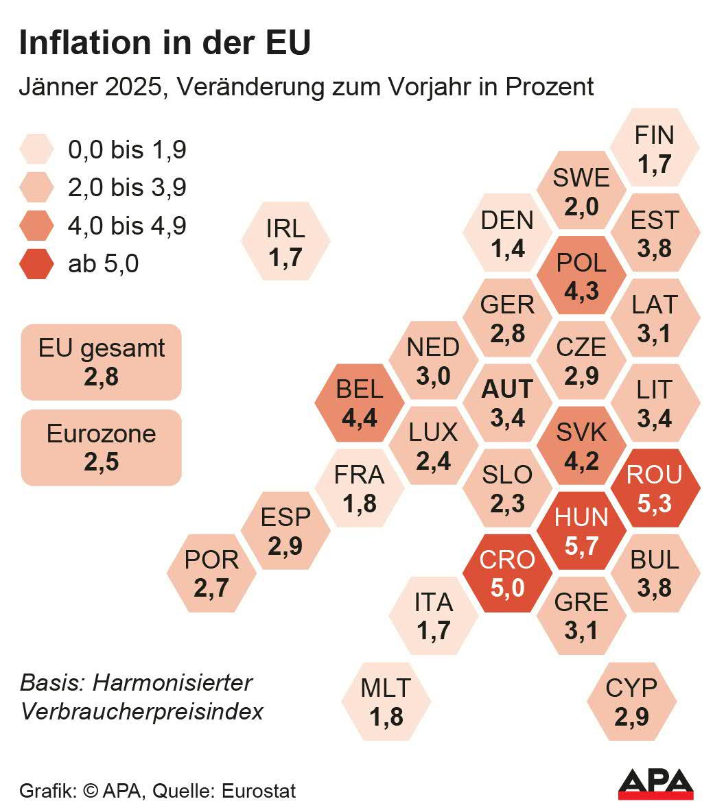 Im Februar war die Teuerungsrate in der 20-Länder-Gemeinschaft wieder etwas gesunken. Sie ging auf 2,4 Prozent zurück - von 2,5 Prozent im Jänner. Ziel der EZB ist eine Inflationsrate von 2,0 Prozent.