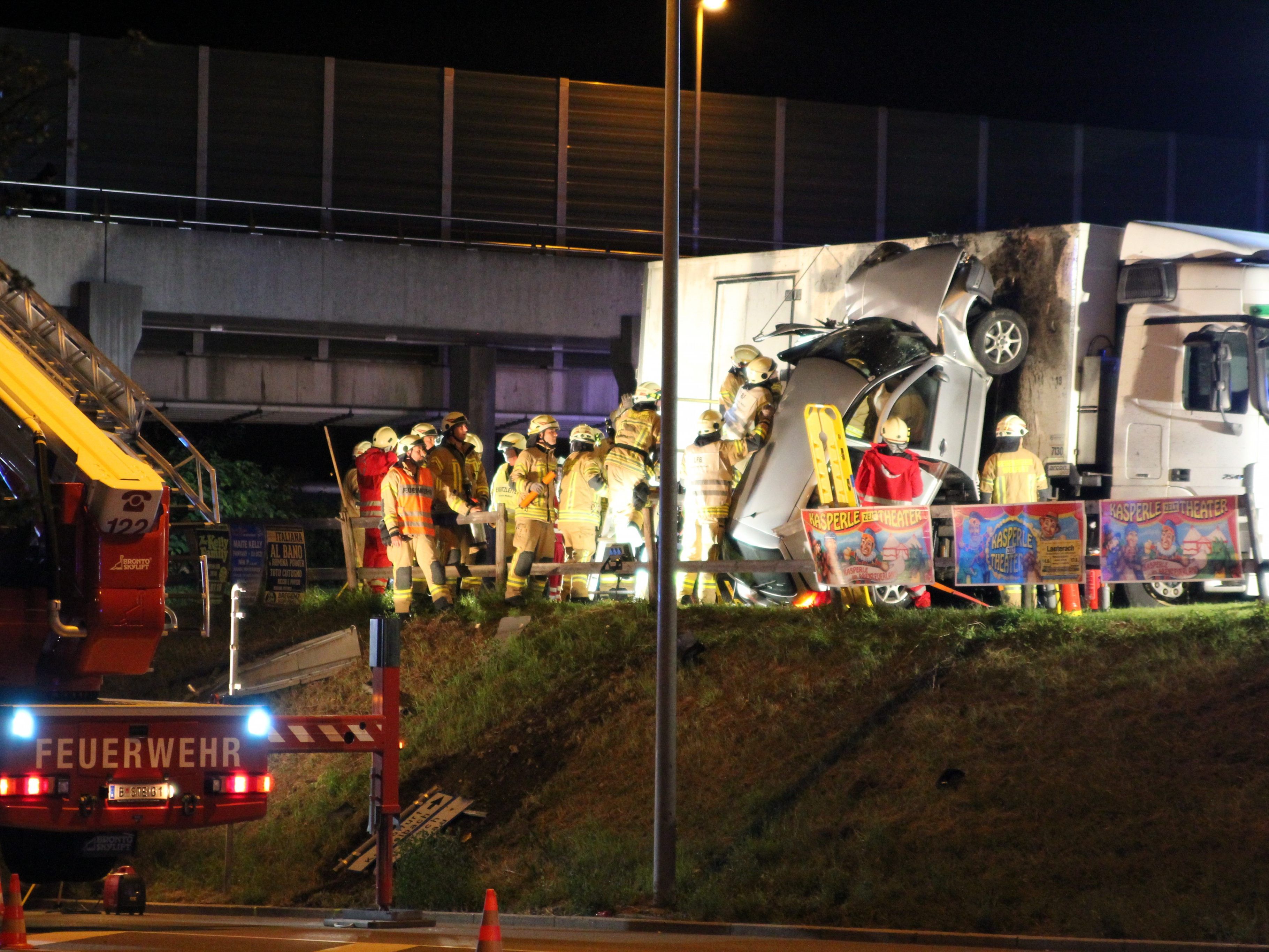 Das Fahrzeug fuhr von der Autobahnabfahrt Wolfurt kommend scheinbar ungebremst über die Achstraße. In weiterer Folge fuhr der Pkw über eine Anhöhe auf krachte beim Parkplatz einer Bäckerei gegen einen stehenden Lkw. Der Pkw kam aufrecht stehend auf der Seite des Lasters zum stehen. Die Lenkerin selbst wurde bei dem Unfall unter dem Amaturenbrett eingeklemmt.