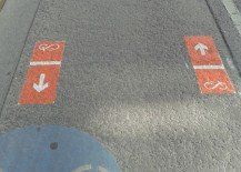 Dass man den Verlauf der City-Durchfahrt übersieht, kann so gut wie gar nicht passieren. Neben Schildern, gibt es neben den Bordsteinkanten kleine Markierungen am Boden angebracht, die einem im Zweifelsfall anzeigen, dass man sich noch immer auf dem Themenradweg durch die Innenstadt befindet.
