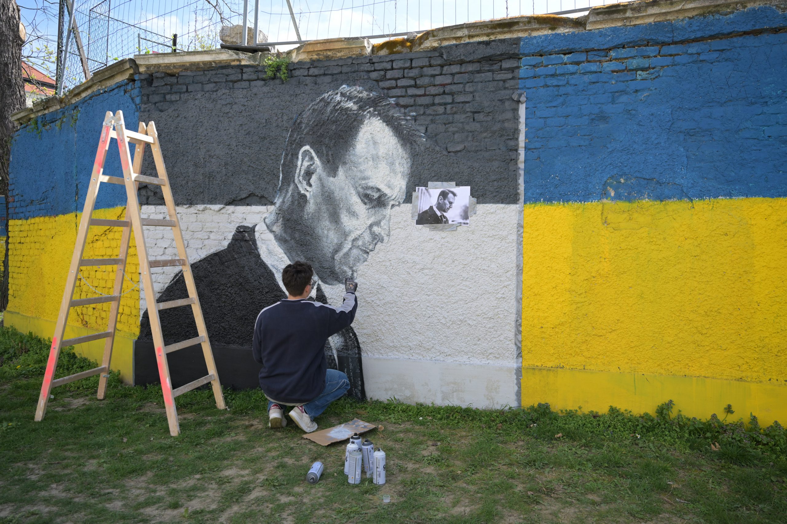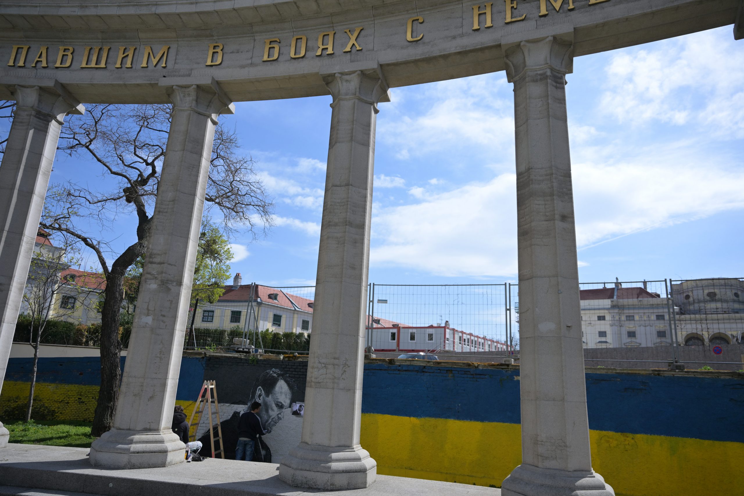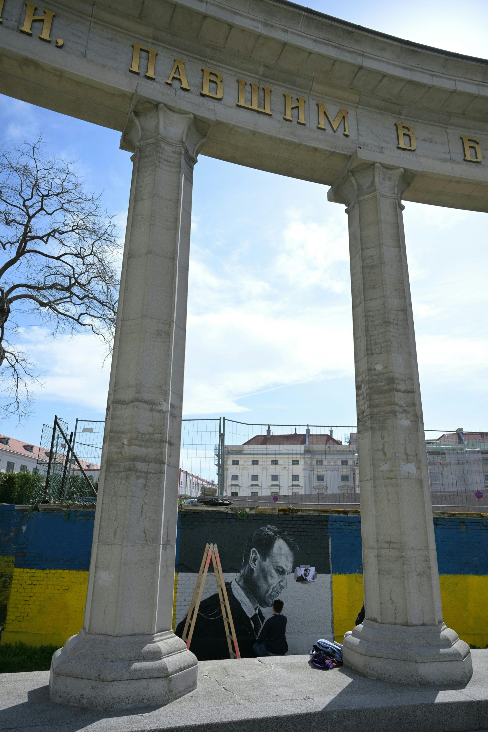 Schon im Jahr 2022 sorgten der frühere tschechische Außenminister und sein Sohn Johannes dafür, dass eine Mauer des Familienpalais am Rand des Schwarzenbergplatzes in den ukrainischen Nationalfarben Blau und Gelb gestrichen wurde. Dies diente als Zeichen der Solidarität mit der Ukraine und als Mahnung an die Rolle der Ukrainer bei der Befreiung Wiens im Jahr 1945. Kürzlich brachten darauf das österreichische Graffiti-Künstlerpaar Joel Gamnou, beauftragt durch eine Stiftung, zwei Porträts des russischen Oppositionellen an, die auf Pressebildern basieren: Neben den Pfeilern des sowjetischen Ehrenmals zeigen sie jetzt eine Darstellung von Nawalny in Anzug und Krawatte aus einer bedeutenden Gerichtsverhandlung vor etwa einem Jahrzehnt und ein bekanntes Bild des Politikers, der seine Hände zu einem Herzen formt.