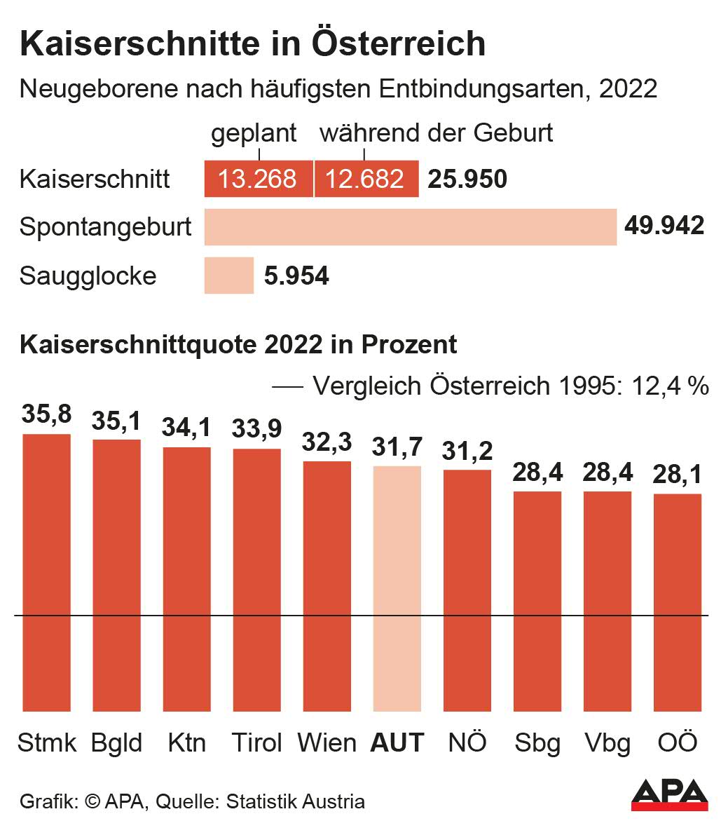 Demnach wurden 31,7 Prozent der 81.892 in Österreich lebend geboren Kinder auf diesem Weg entbunden. "Damit hat sich die Zahl der Kaiserschnittgeburten in den vergangenen 25 Jahren mehr als verdoppelt", so Statistik Austria-Generaldirektor Tobias Thomas. Im EU-Vergleich liegt Österreich im oberen Mittelfeld.