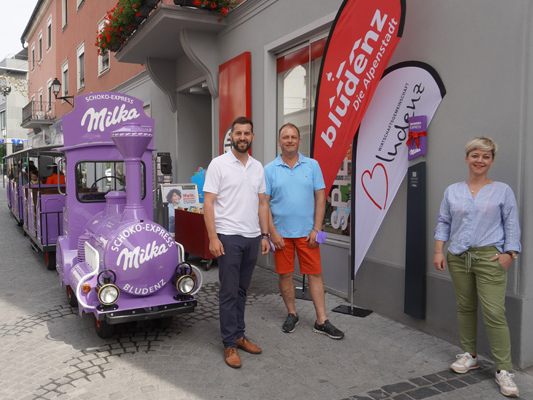 Der Milka Schoko-Express ist bei guter Witterung jeden Samstag von 10 bis 13 Uhr unterwegs. Zum günstigen Preis von €1,- pro Person lädt die Wirtschaftsgemeinschaft Bludenz zur Einkaufstour und Stadtrundfahrt durch die schönen Altstadtgassen ein. Auf dem Weg vom Josef-Wolf-Platz über das Untere Tor hält das Zügle selbstverständlich auch beim Milka Lädele (Fohrenburgstraße 1), wo lila Freuden und zarte Schokolade erhältlich sind. Mehr Informationen zum Schoko-Express können mittels Scan des QR-Codes auf den Schoko-Express Haltestellen oder unter www.wigebludenz.at abgefragt werden.
