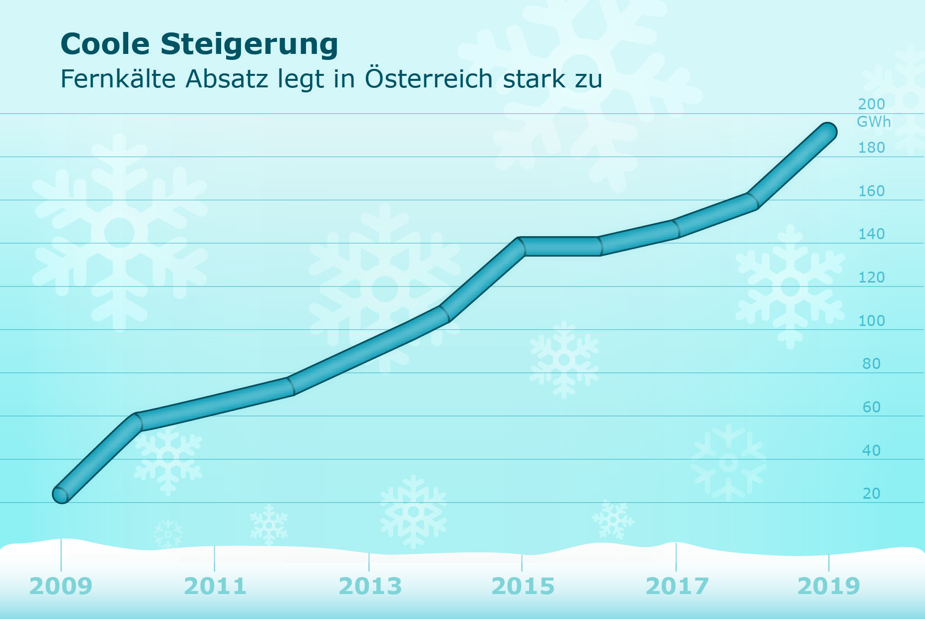 Die Fernkälte-Leistung lag Ende 2019 österreichweit bei 159 Megawatt (MW), nach 138 MW Ende 2018. Besonders große Zuwächse gab es in Wien und Graz. Zu den "Coolen Spots" zählten auch Linz und St. Pölten. In Wien wächst der Bedarf nach früheren Angaben der Wien Energie im Durchschnitt um 10 bist 15 Prozent pro Jahr. Die Lieferung stieg im Vorjahr von 124 auf 156 GWh. Insgesamt ersetze die Fernkälte heute bereits über 50.000 herkömmliche Klimaanlage ("Split"-Geräte) und spare mehr als 19.000 Tonnen CO2.
