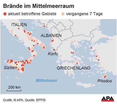 Auf dem Festland hat sich in der nördlichen Region Ligurien unweit der Grenze zu Frankreich ein größerer Brand entwickelt. In Ventimiglia an der italienischen Riviera versuchen Einsatzkräfte der Feuerwehr die Flammen zu löschen. Der Einsatz gestaltet sich schwierig, da sich das Feuer über ein steiles Berggebiet erstreckt, das schwer erreichbar ist. In den südlichen Regionen des Festlandes, in Kalabrien und Apulien, wo in den vergangenen Tagen auch Wald- und Flächenbrände wüteten, hat sich die Lage aktuell entspannt.