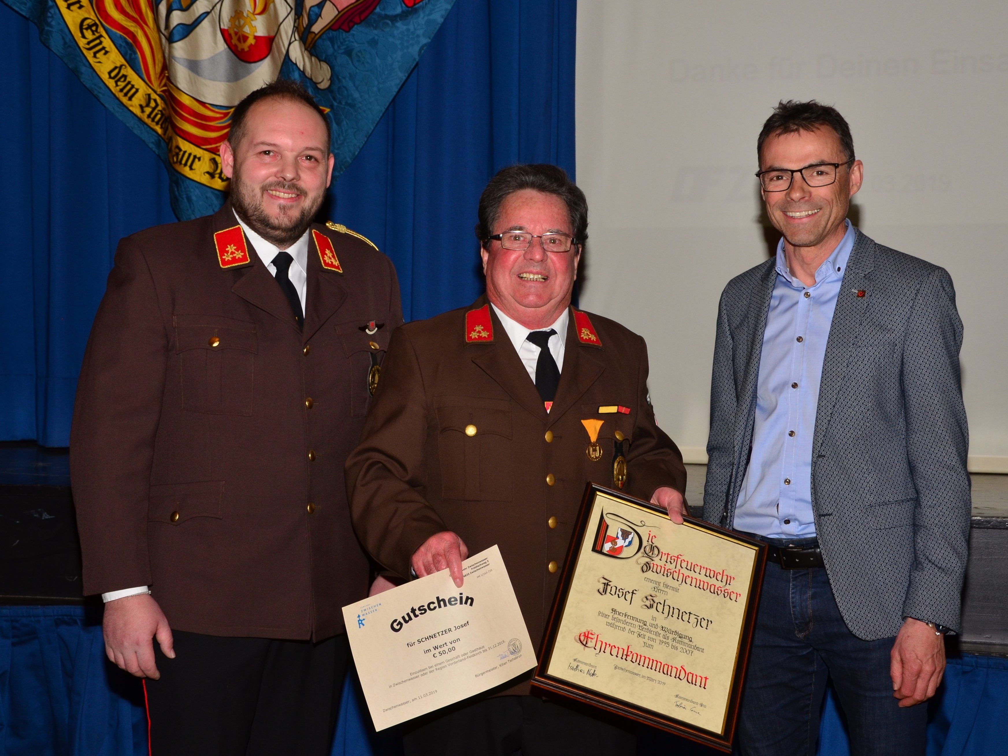 Zwischenwasser. Einen neuen Ehrenkommandanten bekommt eine Feuerwehr nicht jeden Tag, in Zwischenwasser ist das seit kurzem Josef Schnetzer, der für seine jahrelange Tätigkeit den Ehrentitel verliehen bekam. Seit 50 Jahren im Dienst der Wehr steht Engelbert Rietzler, der dafür die Feuerwehrmedaille in Gold von Bezirksfeuerwehrinspektor Manfred Morscher überreicht bekam. Wilhelm Bickel wurde mit dem Verdienstkreuz in Bronze ausgezeichnet, Bickel ist seit 27 Jahren als Dienstgra in verschiedenen Leitungsfunkionen, aktuell als Fahrzeugwart tätig. Ebenfalls ausgezeichnet mit Geschenken wurden die fleißgien Nachwuchsfeuerwehrleute. Jeder erhielt einen Feuerwehrrucksack versehen mit seinem Namen. Drei Nachwuchsmitglieder wurden in den aktiven Stand übernommen.