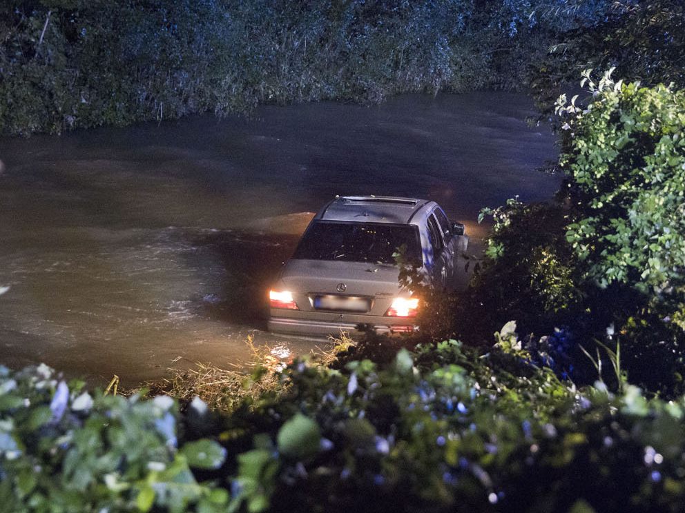 Ein Autofahrer war von der Straße abgekommen, hatte mit seinem Mercedes einen Holzzaun durchbrochen und war über die Böschung in den Fluss Triesting gefahren. Zum Glück war der Hochwasserstand des Triesting stark zurückgegangen und die Strömungsgeschwindigkeit deutlich geringer als an den vorherigen Tagen. Der Fahrer befand sich nicht mehr in dem im Wasser stehenden Auto und wurde vom Rettungsdienst betreut.