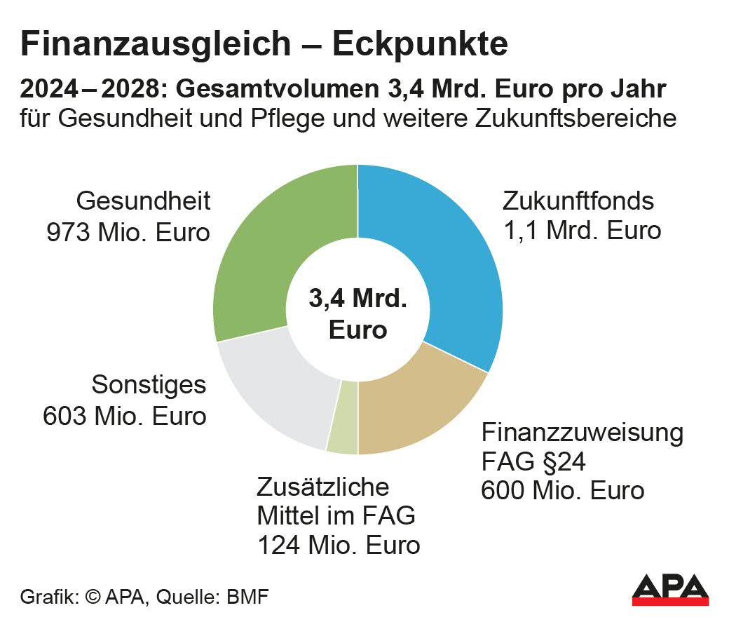 Laut der am Dienstagabend verkündeten Einigung stellt der Bund den Ländern im Rahmen des Finanzausgleichs von 2024 bis 2028 2,4 Milliarden "frisches Geld" pro Jahr zur Verfügung. Gemeinsam mit Zahlungen an Sozialversicherung und für die Pflegereform kommt der Bund damit auf insgesamt 3,4 Milliarden Euro Ausgaben jährlich, wie Brunner nach dem Ministerrat am Mittwoch erklärte. Neu ist, dass die Gelder valorisiert werden: Im Gesundheits- und Pflegebereich werden sie ab 2025 jährlich um die Inflationsrate plus zwei Prozentpunkte erhöht, die Gelder des Zukunftsfonds werden an die Inflation angepasst, wie Brunner ankündigte.