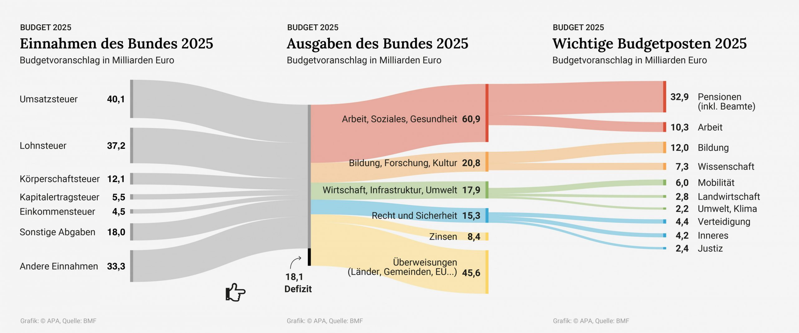 Was die Aufteilung des Defizits zwischen den Sektoren angeht, soll der Bund heuer und kommendes Jahr ein Defizit von 3,5 Prozent verbuchen, Länder und Gemeinden heuer von einem Prozent und 2026 dann 0,7 Prozent. Der Finanzminister verwies darauf, dass die anderen Gebietskörperschaften ja von den steuerlichen Maßnahmen profitieren würden, alleine im kommenden Jahr mit plus 350 Millionen. Die Sozialversicherung soll - auch dank Maßnahmen wie dem steigenden Krankenversicherungsbeitrag für Pensionisten und der erhöhten E-Card-Gebühr - in beiden Jahren ausgeglichen bilanzieren.