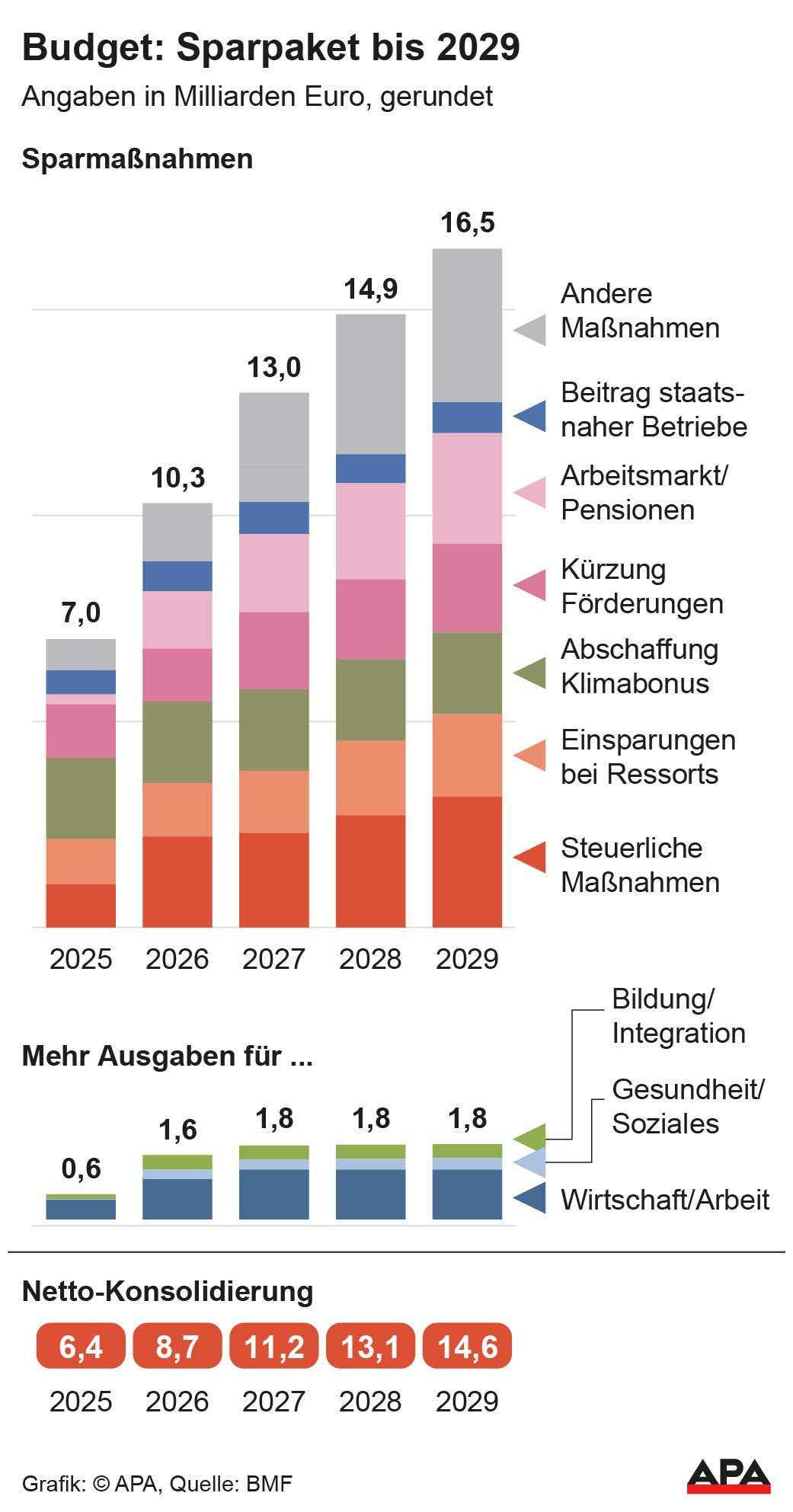 Der Konsolidierungsbetrag soll heuer 6,4 Milliarden betragen, im kommenden Jahr 8,7 Milliarden. Das macht sogar höhere Einsparungen notwendig, da auch Offensivmaßnahmen etwa für ältere Arbeitslose oder das zweite Kindergartenjahr gesetzt werden. Die Einsparungen betragen somit heuer sieben Milliarden und 2026 sogar 10,3 Milliarden.