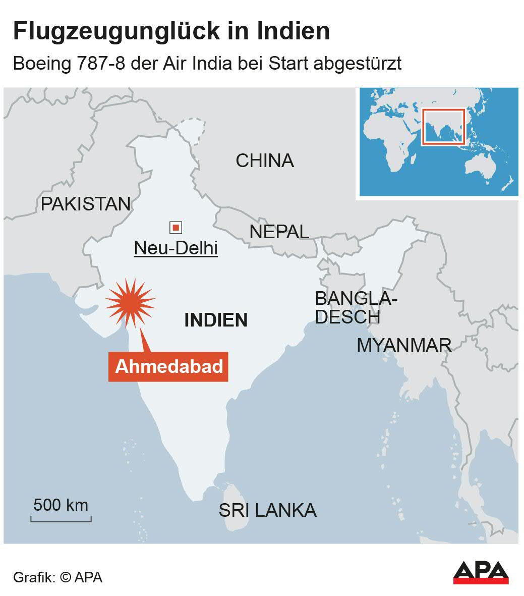 US-Präsident Donald Trump bot indes Unterstützung an. Indien sei ein "großes" und "starkes" Land, doch die Vereinigten Staaten stünden bereit, im Bedarfsfall sofort Hilfe zu leisten, sagte der Republikaner bei einer Veranstaltung im Weißen Haus in Washington. Trump zeigte sich betroffen und sprach von einem "furchtbaren Absturz" und "einem der schlimmsten in der Geschichte der Luftfahrt".
