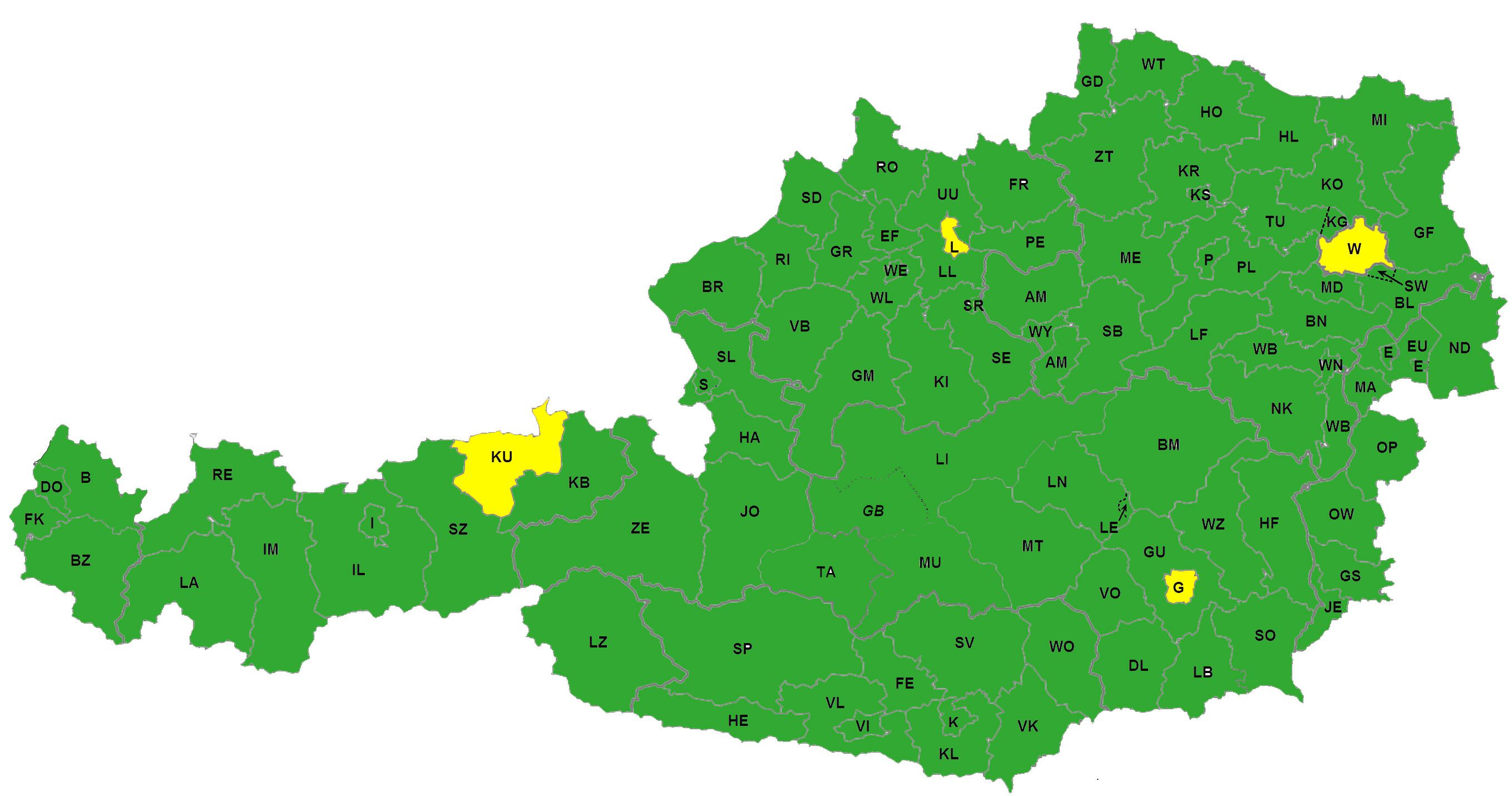 Betroffen von "gelb" sollen der Bezirk Kufstein sowie die Metropolen Wien, Linz und Graz sein. Bei allen anderen Bezirken bleibt es wohl vorerst bei grün.