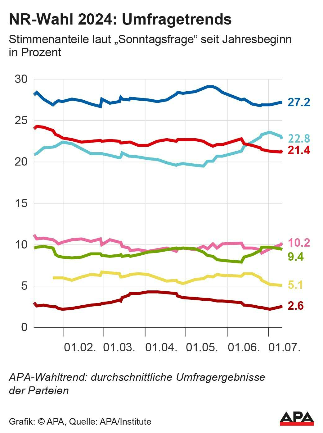 Die FPÖ liegt im APA-Trend, der Umfragen aus den jeweils vergangenen fünf Wochen berücksichtigt und nach Aktualität gewichtet, weiter mit 27,2 Prozent stabil auf Platz eins. Klar dahinter liefern sich ÖVP und SPÖ nach wie vor ein Rennen um Platz zwei, NEOS und Grüne eines um Platz vier.