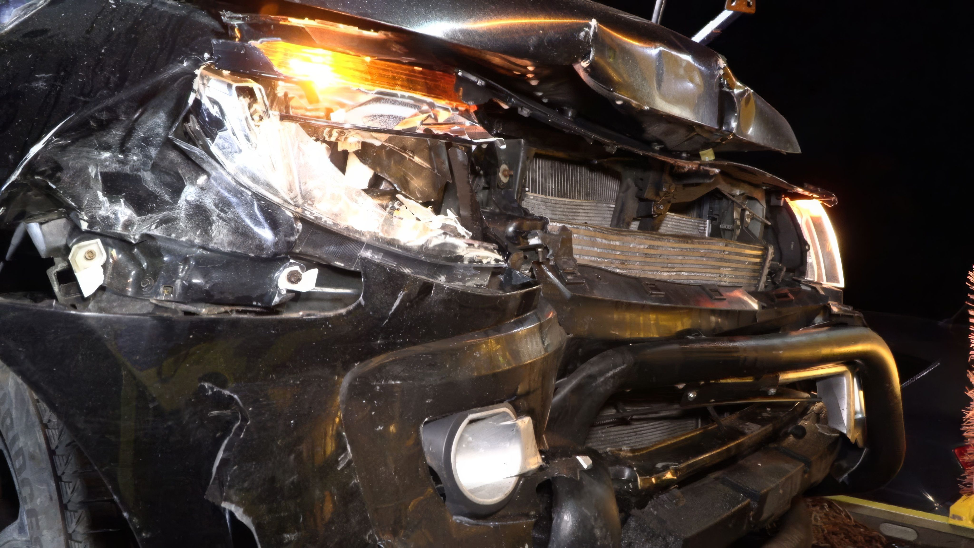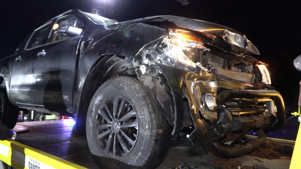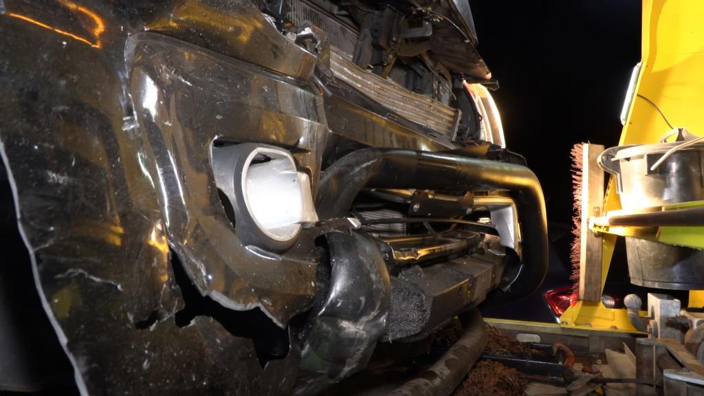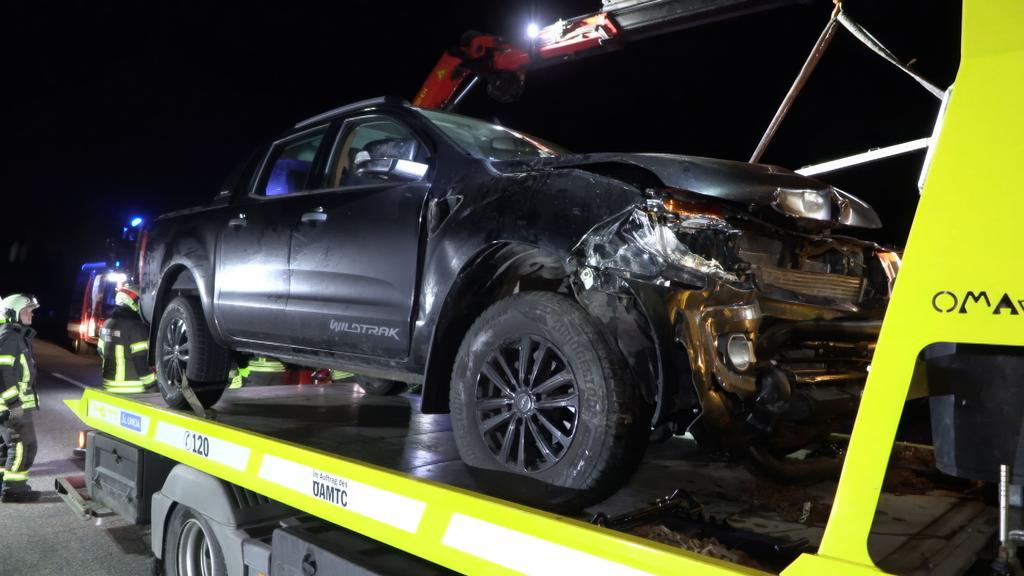 Der zweite Wagen, ein Pickup, steht auf einem Abschleppfahrzeug – die Frontpartie komplett deformiert.