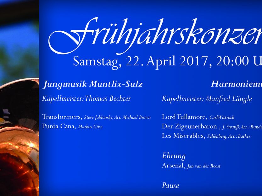 Die Harmoniemusik Muntlix lädt herzlich zum traditionellen Frühjahrskonzert am Samstag, 22.4.2017 um 20 Uhr in den Frödischsaal in Muntlix ein.