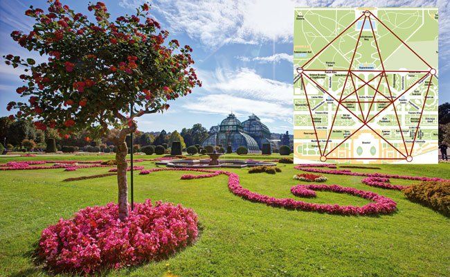 Doch was ist nun so besonders am Garten, den jeder zu kennen meint? Er ist voll von magischen Symbolen. Regelmäßige, rechtwinkelige und diagonale Muster des Grundrisses lassen sich miteinander verbinden und eröffnen somit, dass die Parkarchitektur aus Alleen, Brunnen, Obelisken, Pavillons und anderen Gartenelementen ein Pentagramm – ein uraltes Schutzzeichen – ergibt. Die fünf Eckpunkte sind dabei die fünf wichtigsten Gebäude des Gartens: Gloriette, Tiergarten, Wagenburg, Orangerie und Obelisk. Reiner Zufall?