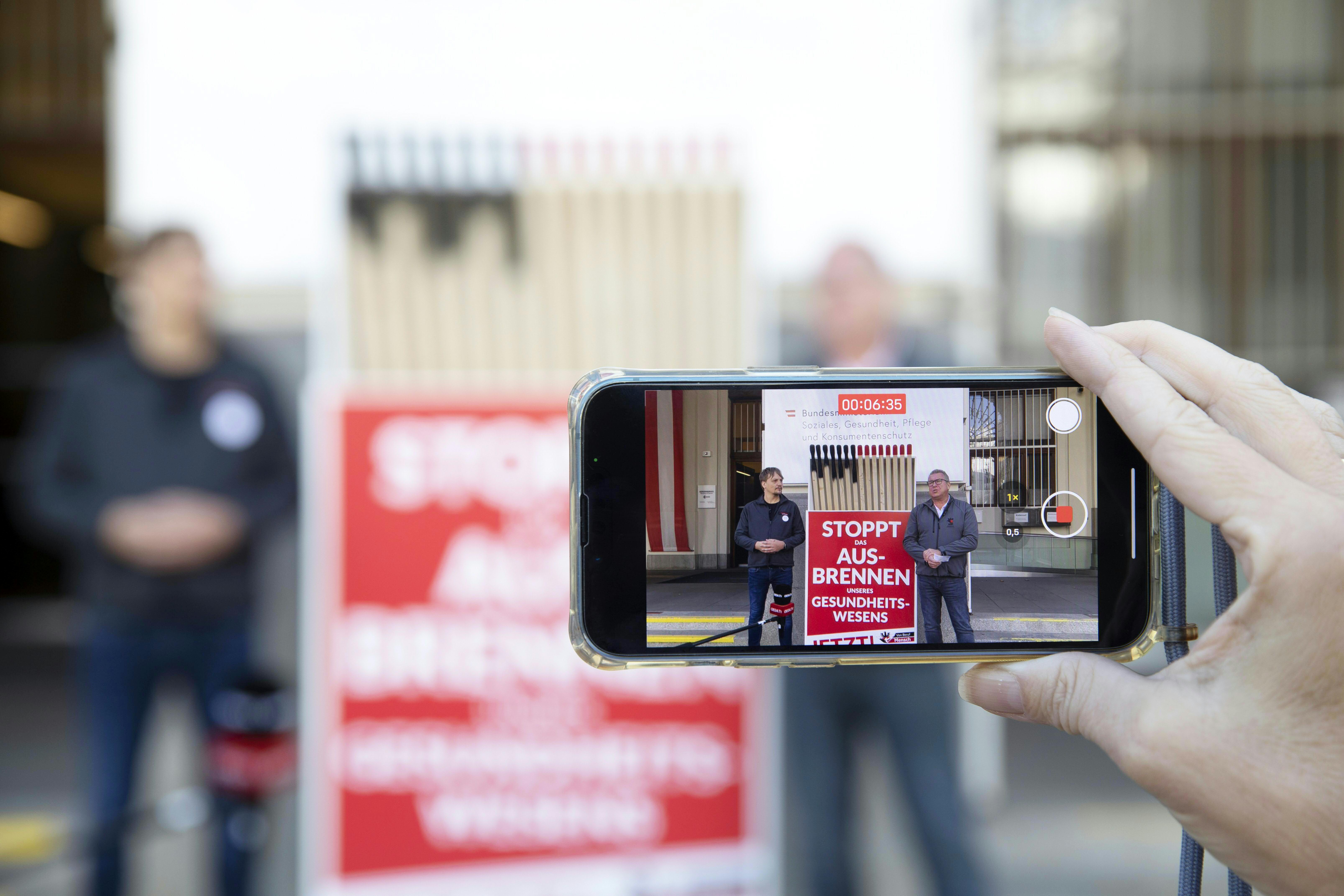 Die Zahl der gesperrten Spitalsbetten sei seit Mai um 24 Prozent auf österreichweit 3.442 gestiegen, hieß es in einer Medienaktion. Dabei wurde eine mannshohe Streichholzschachtel als Symbol für das Ausbrennen des Personals vor dem Gesundheitsministerium aufgestellt.