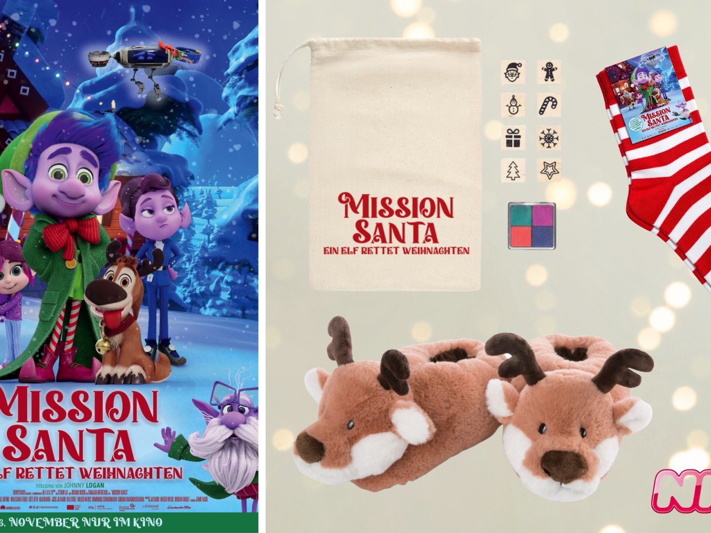 Gewinne bei uns zum Filmstart ein Fanpaket, bestehend aus 1x Rentier-Hausschuhe von NICI, 1x MISSION SANTA Socken und 1x MISSION SANTA Stempelset. Viel Glück!