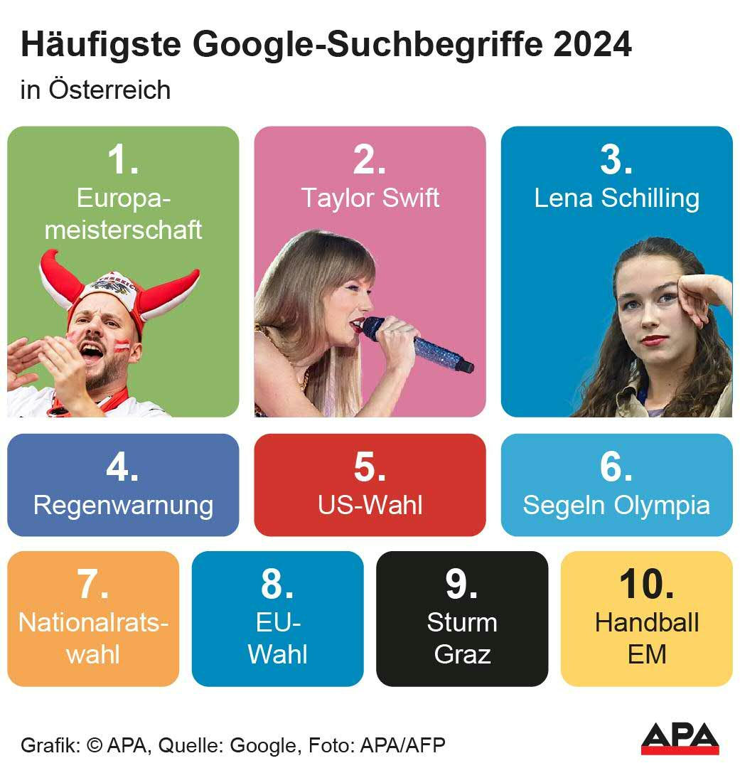 "Europameisterschaft" war 2024 der meistgesuchte Begriff in Österreich, während Lamine Yamal in der Kategorie "Sportler international" führt und Matthias Mayer bei Österreichs Sportlern. Die "Handball EM" und "Segeln Olympia" landeten ebenfalls in den Top 10. Kontroversen gab es um den "Wolfsgruß", eine rechtsextreme Geste eines türkischen Fußballers.