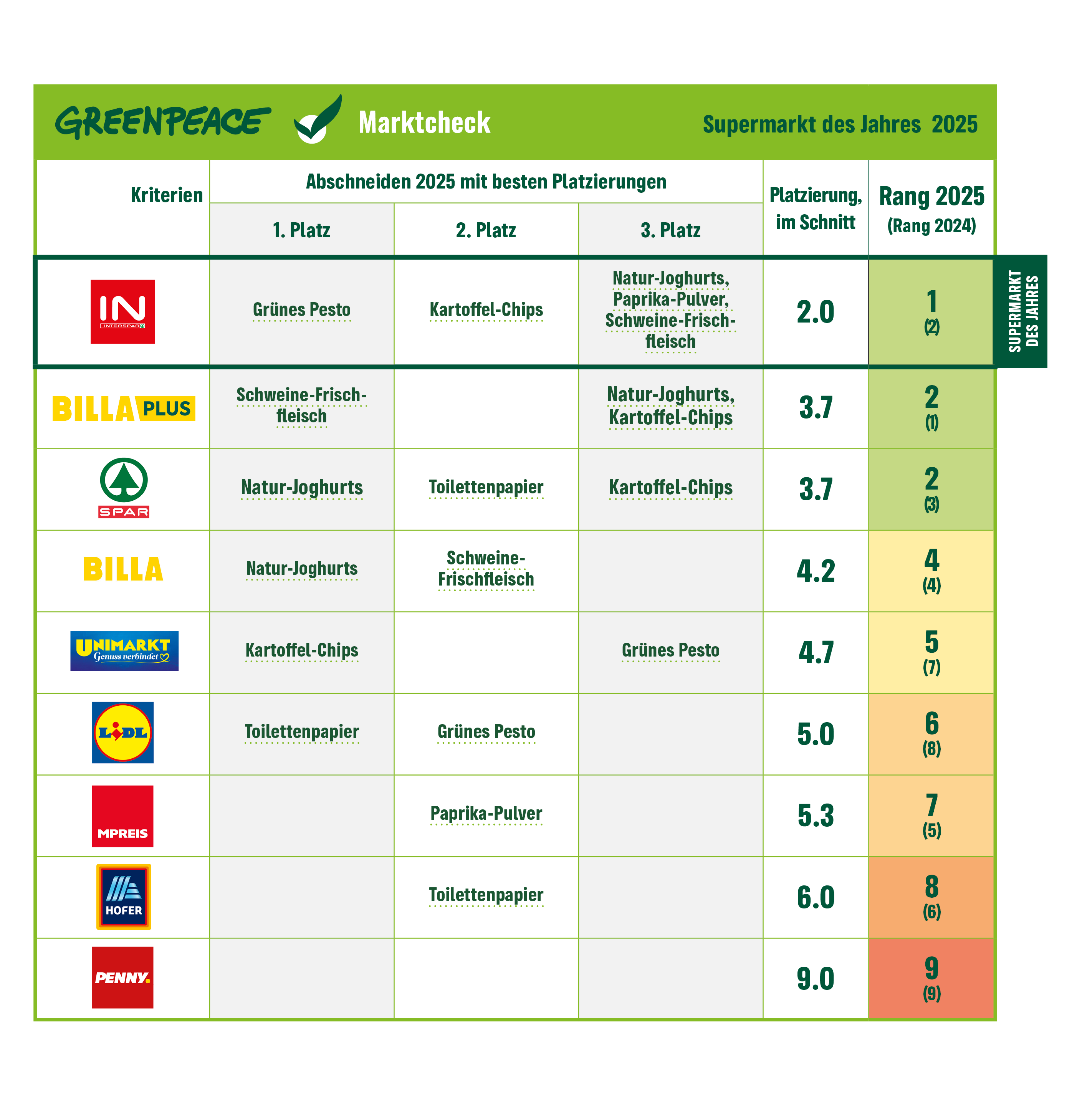 In fünf von sechs Kategorien konnte Interspar 2025 einen Platz am Podest erreichen. Besonders gut schnitt die Supermarktkette beim Sortiment biologisch hergestellter Lebensmittel und bei regionalen Produkten ab. Auch das Angebot rein pflanzlicher Alternativen – als besonders klimafreundlich bewertet – wurde von Greenpeace hervorgehoben.